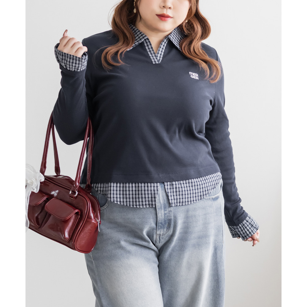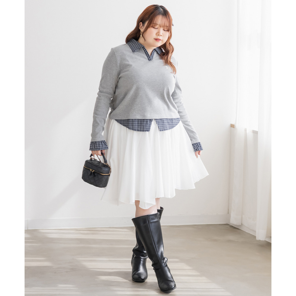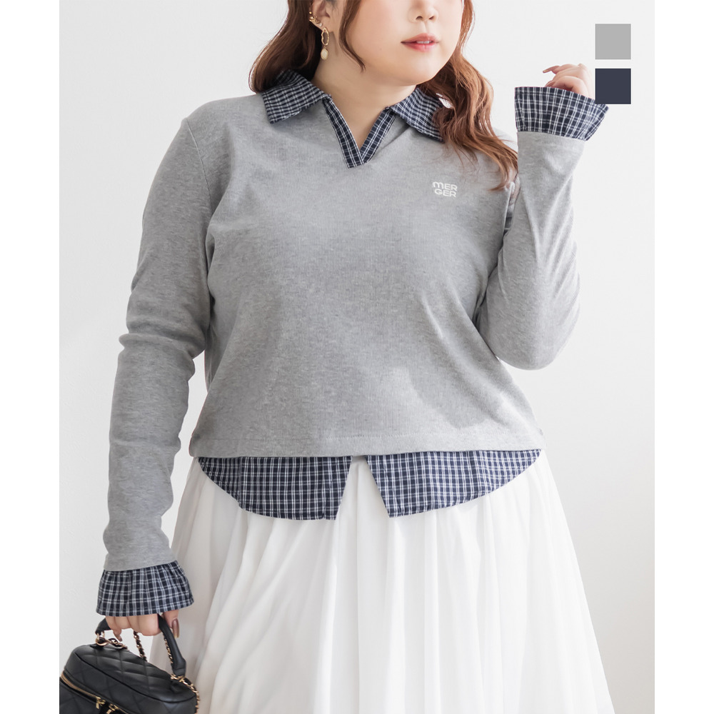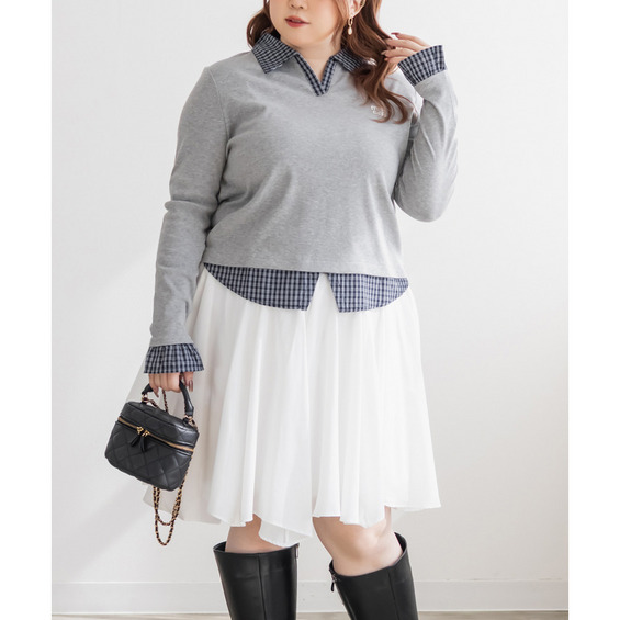 | 3Lサイズを着用してピッタリサイズでした!フィット感がありつつ伸縮性のあるリブカットソー生地なので窮屈感はなかったです。シャツを重ねたようなドッキングデザインが一枚でスタイリングを完成させてくれる優秀トップスで、 着丈が長すぎず裾出しで着て可愛い1枚です♪シャツがチェック柄なのが今っぽく韓国風コーデにもピッタリ!デニムや可愛いスカートにも相性良く着られます◎ |