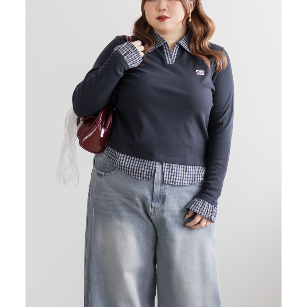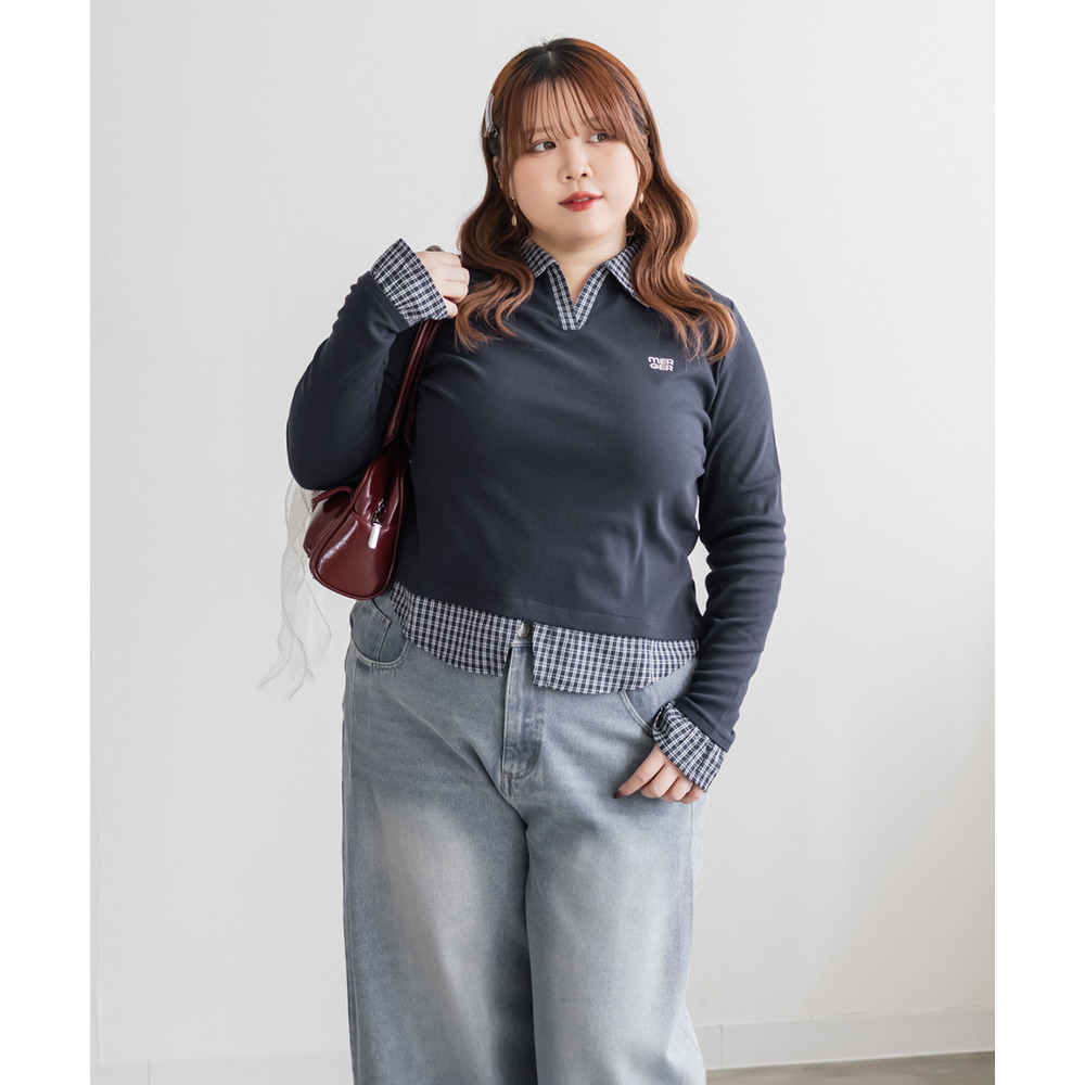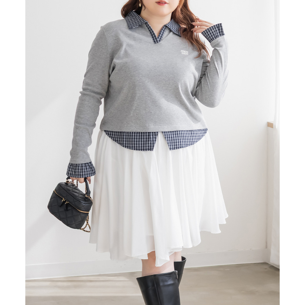 | 3Lサイズを着用してピッタリサイズでした!フィット感がありつつ伸縮性のあるリブカットソー生地なので窮屈感はなかったです。シャツを重ねたようなドッキングデザインが一枚でスタイリングを完成させてくれる優秀トップスで、 着丈が長すぎず裾出しで着て可愛い1枚です♪シャツがチェック柄なのが今っぽく韓国風コーデにもピッタリ!デニムや可愛いスカートにも相性良く着られます◎ |