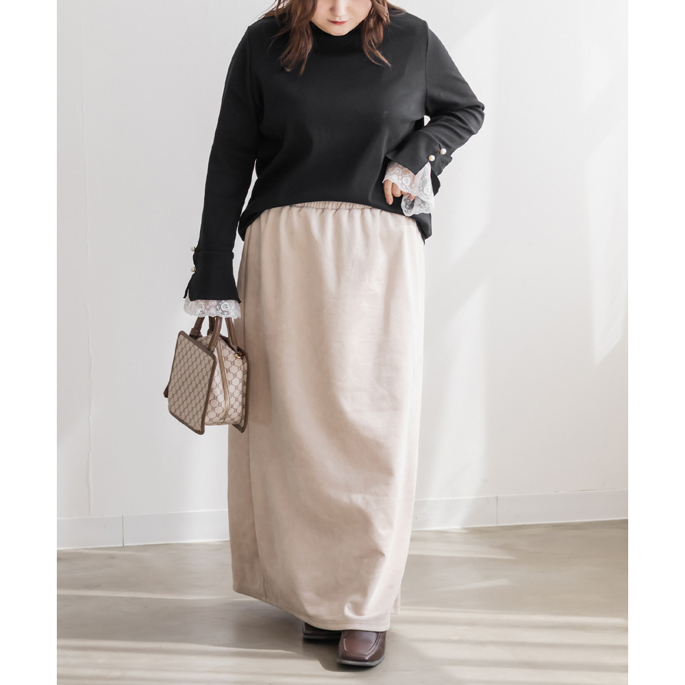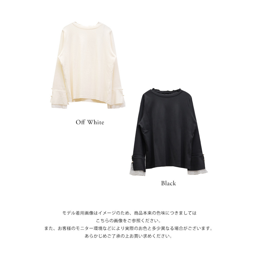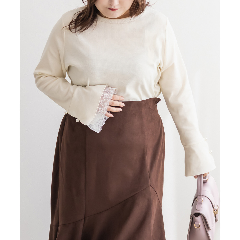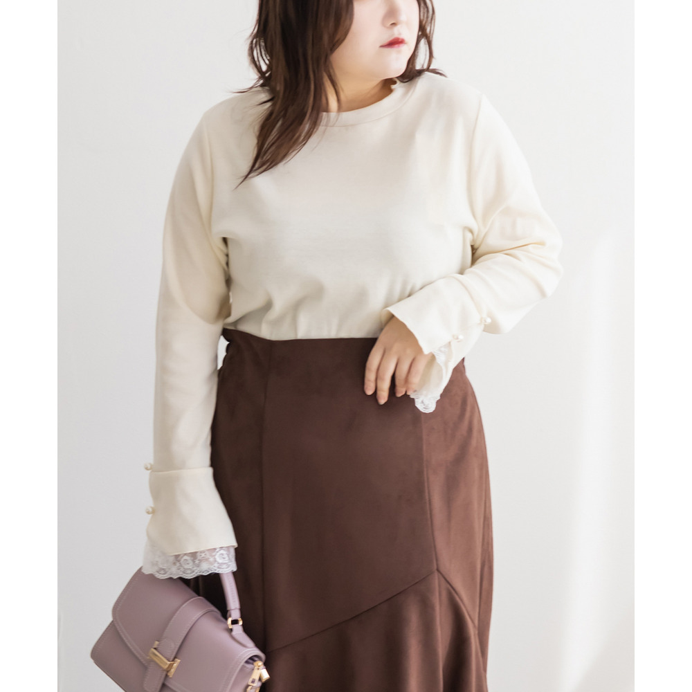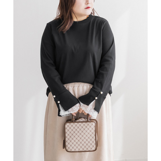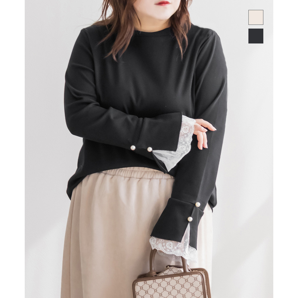 | 3Lサイズを着用してちょうどいいサイズ感でした。伸縮性の良いカットソー着心地ラクチンでした◎リブなのですっきりとした印象ながらボディラインを拾いにくいのもポイントです。袖にレースとボタンがついていてとっても可愛いです♪トップスとして1枚で着てもいいし、キャミワンピなどど重ねてもいいと思います!首元はメローになっているのも可愛いポイントです! |