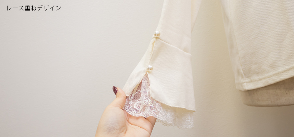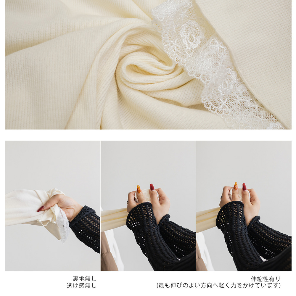 | 素材 | ■素材 【本体】ポリエステル63%、綿34%、ポリウレタン3%、【レース部分】ナイロン100% ■裏地・透け感・伸縮性 裏地無し、透け感無し、伸縮性有り ■ポケット 無し ■生地感 伸縮性のある柔らかなリブ仕様のカットソー素材です。 |