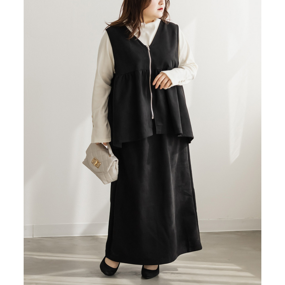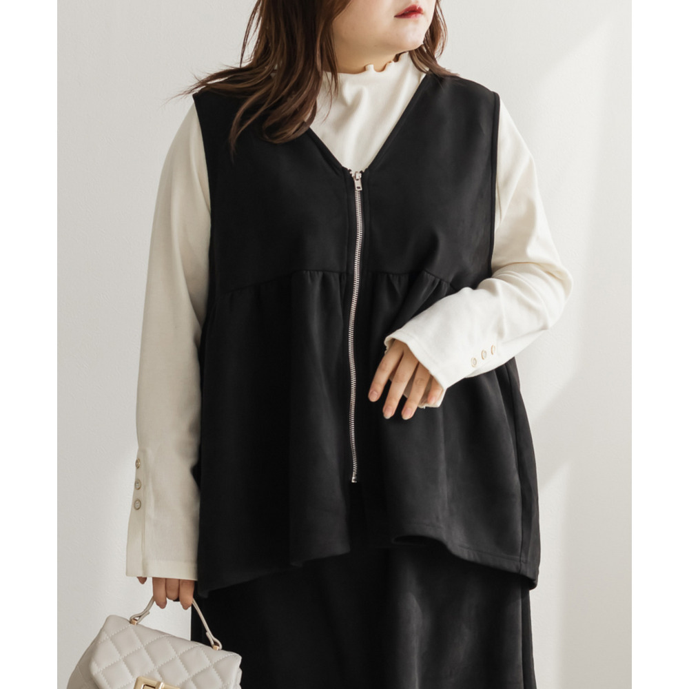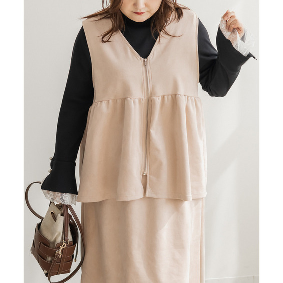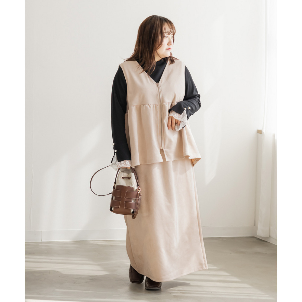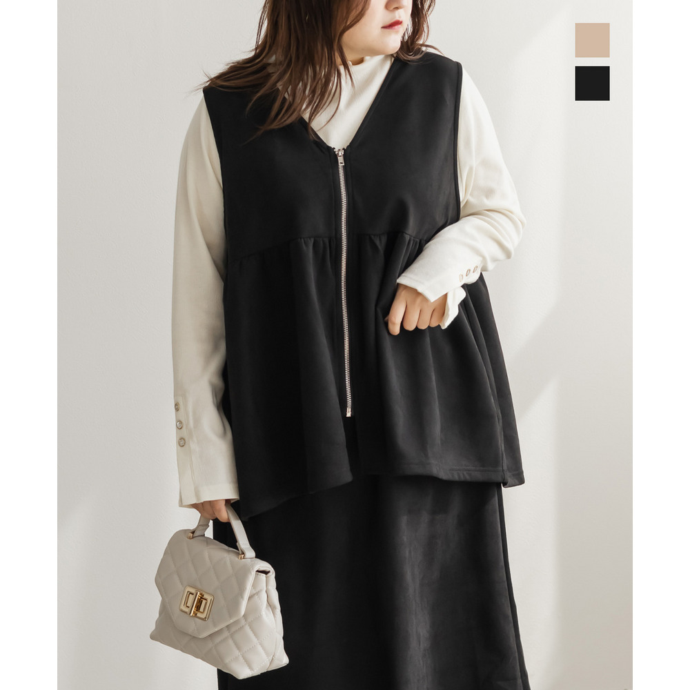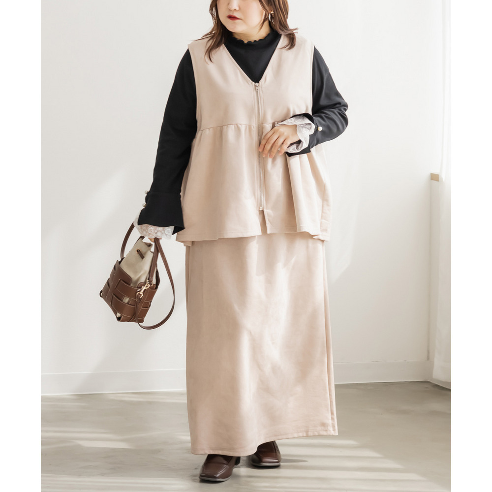 | 3Lを着てゆとりのあるサイズ感でした。ペプラムデザインでスタイルアップが叶うシルエットなのが嬉しいです♪やわらかいスエード生地が季節感がありコーデに取り入れやすいです!お腹周りをカバーしてくれる丈感なので、Tシャツやニットなどシンプルなトップスと重ねるのがお勧めです!ベストなのでコートなどを羽織ることも出来ると思うのでスタイリング次第でたくさん着回しできそうです◎同じ生地のスカートと合わせて着たら大人ぽく着こなせて可愛かったです! |