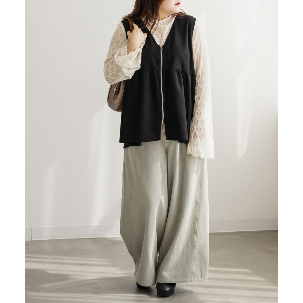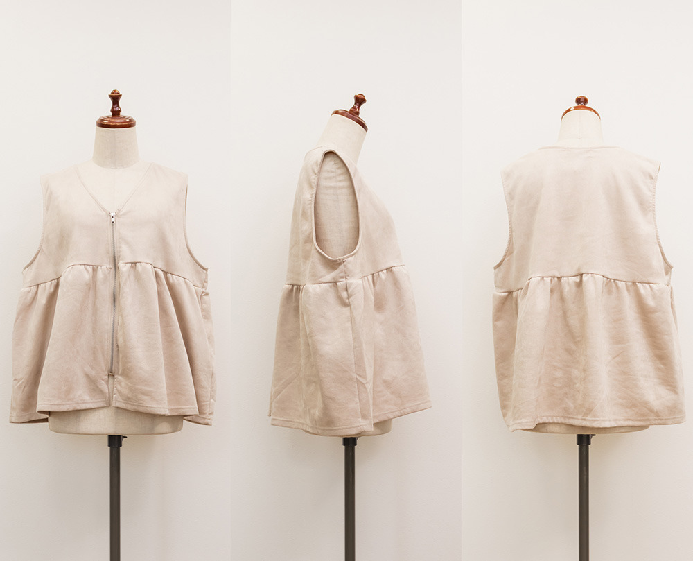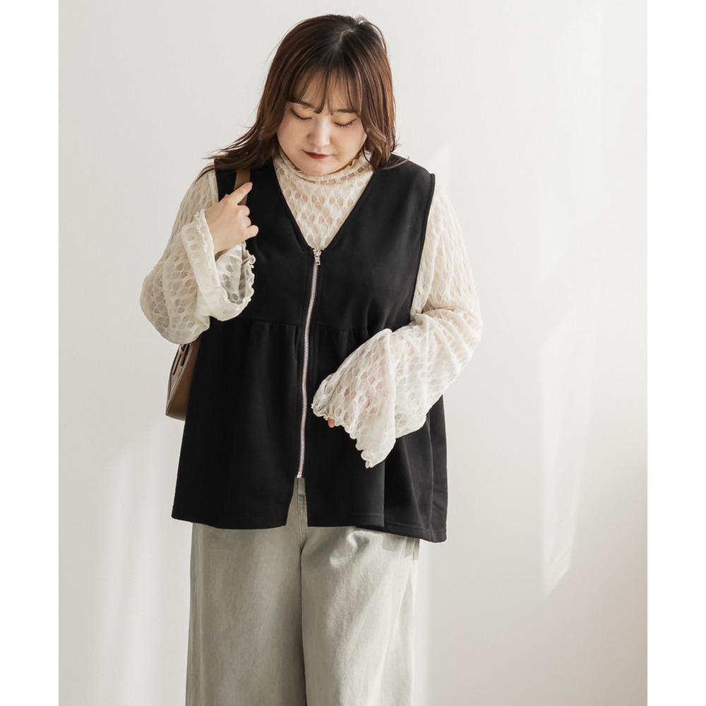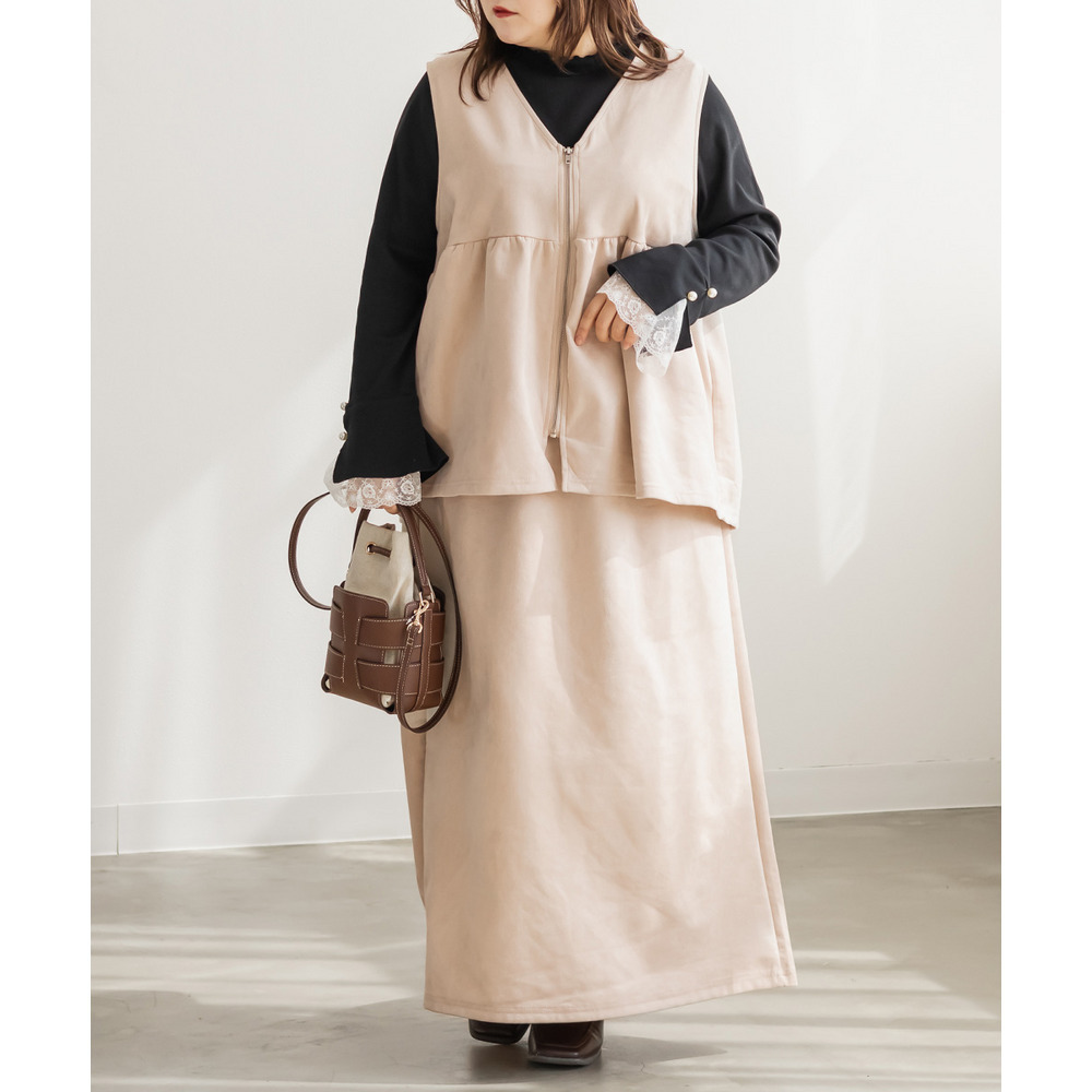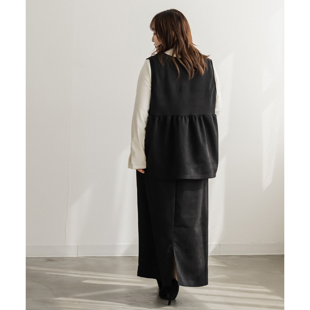 | 3Lを着てゆとりのあるサイズ感でした。ペプラムデザインでスタイルアップが叶うシルエットなのが嬉しいです♪やわらかいスエード生地が季節感がありコーデに取り入れやすいです!お腹周りをカバーしてくれる丈感なので、Tシャツやニットなどシンプルなトップスと重ねるのがお勧めです!ベストなのでコートなどを羽織ることも出来ると思うのでスタイリング次第でたくさん着回しできそうです◎同じ生地のスカートと合わせて着たら大人ぽく着こなせて可愛かったです! |