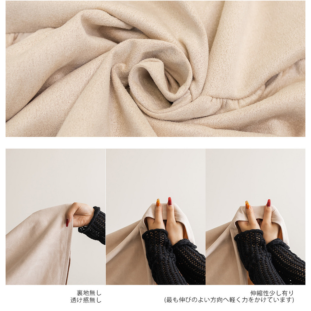 | 素材 | ■素材 ポリエステル95%、ポリウレタン5% ■裏地・透け感・伸縮性 裏地無し、透け感無し、伸縮性少し有り ■ポケット 無し ■生地感 なめらかなスエード調のやや伸縮性のある柔らかなカットソー素材です。 |