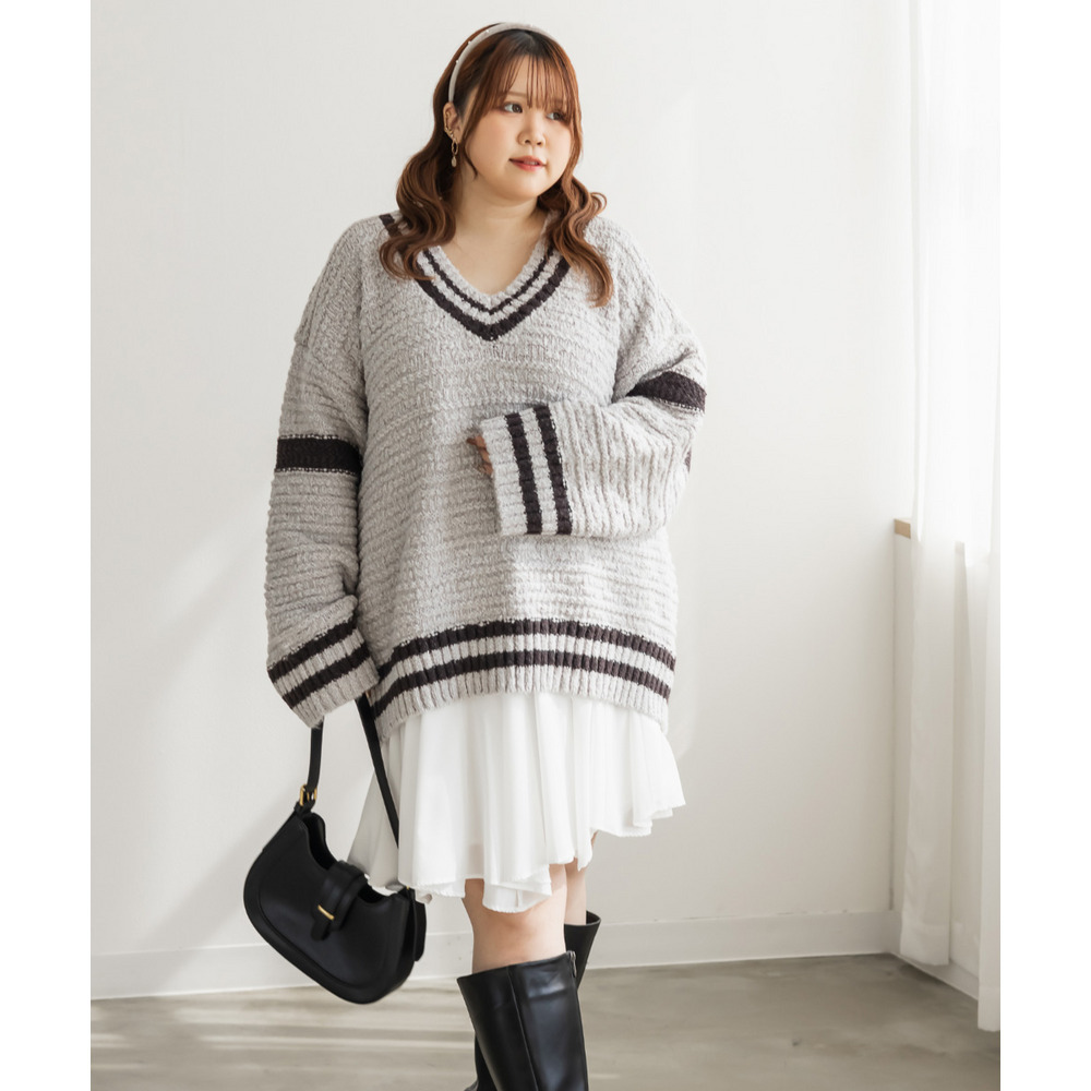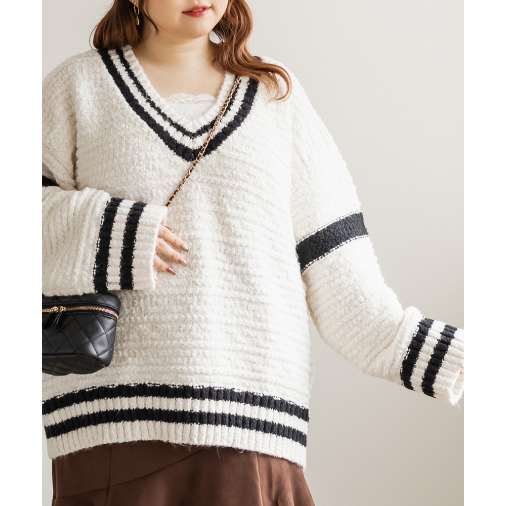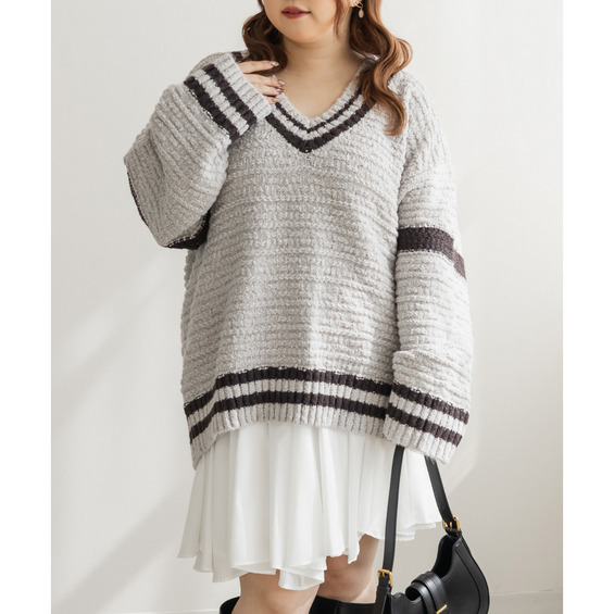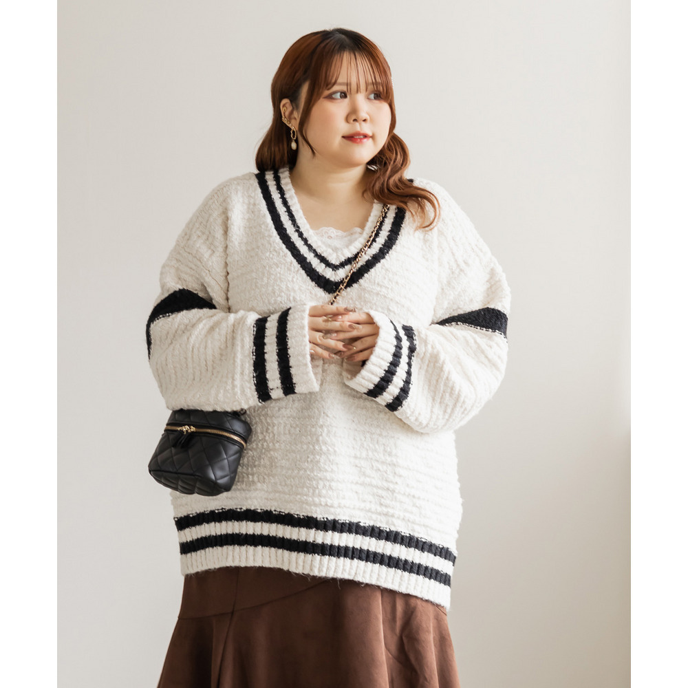 | 3Lサイズを着て、オーバーサイズでゆとりのある着心地でした!ゆるっと着られて可愛いです◎カジュアルめな印象のラインニットですが、スカートと合わせてフェミニンにもなれます♪深いVネックになっているので、ボリュームニットでもメリハリが付きすっきりした印象になります。ミニスカートを合わせてあざとい雰囲気にもおすすめです! |