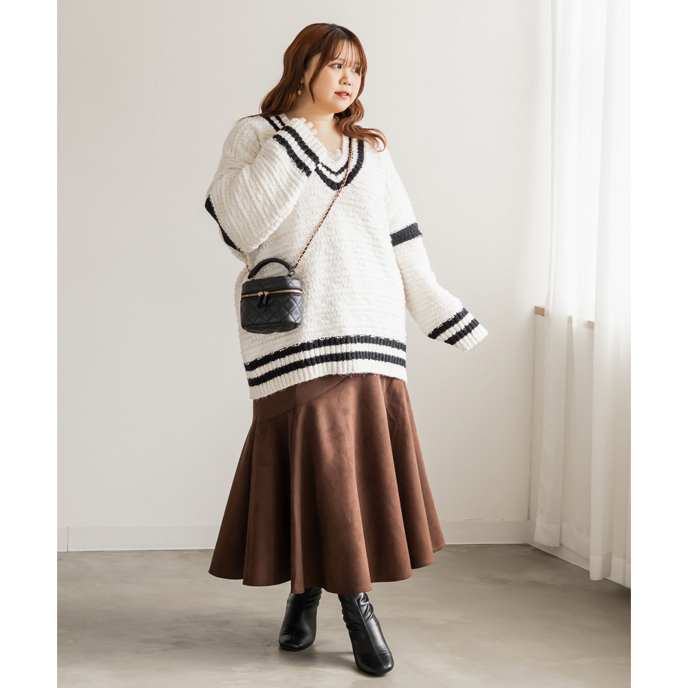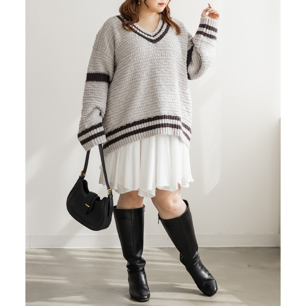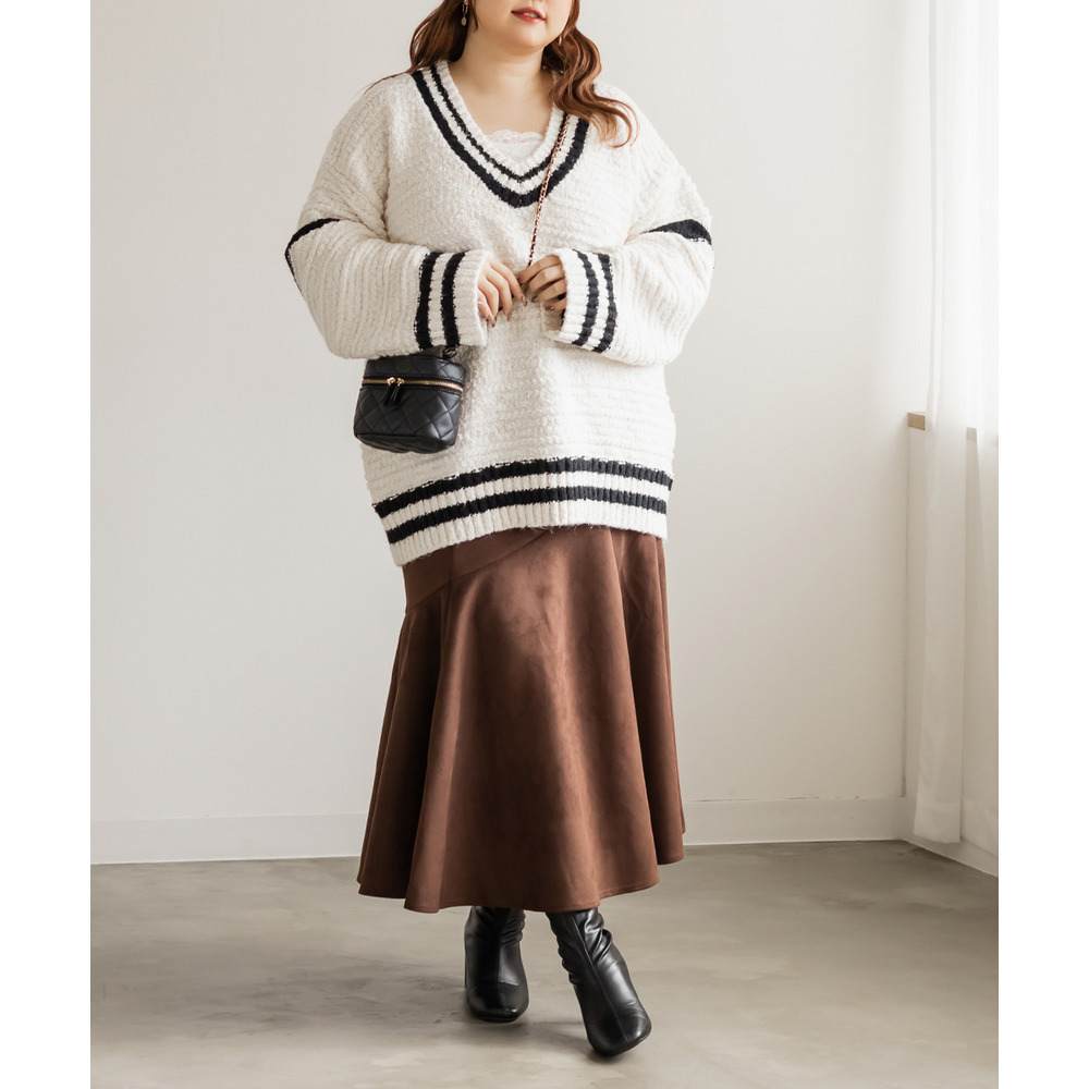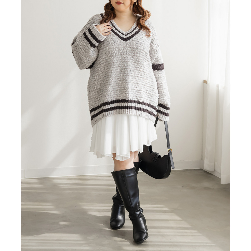 | 3Lサイズを着て、オーバーサイズでゆとりのある着心地でした!ゆるっと着られて可愛いです◎カジュアルめな印象のラインニットですが、スカートと合わせてフェミニンにもなれます♪深いVネックになっているので、ボリュームニットでもメリハリが付きすっきりした印象になります。ミニスカートを合わせてあざとい雰囲気にもおすすめです! |