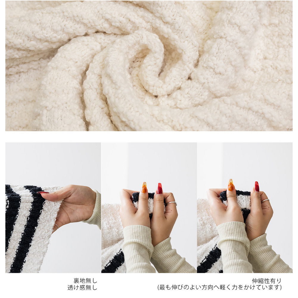 | 素材 | ■素材 ポリエステル80%、アクリル20% ■裏地・透け感・伸縮性 裏地無し、透け感無し、伸縮性有り ■ポケット 無し ■生地感 もちっとした厚手のニットです。 |