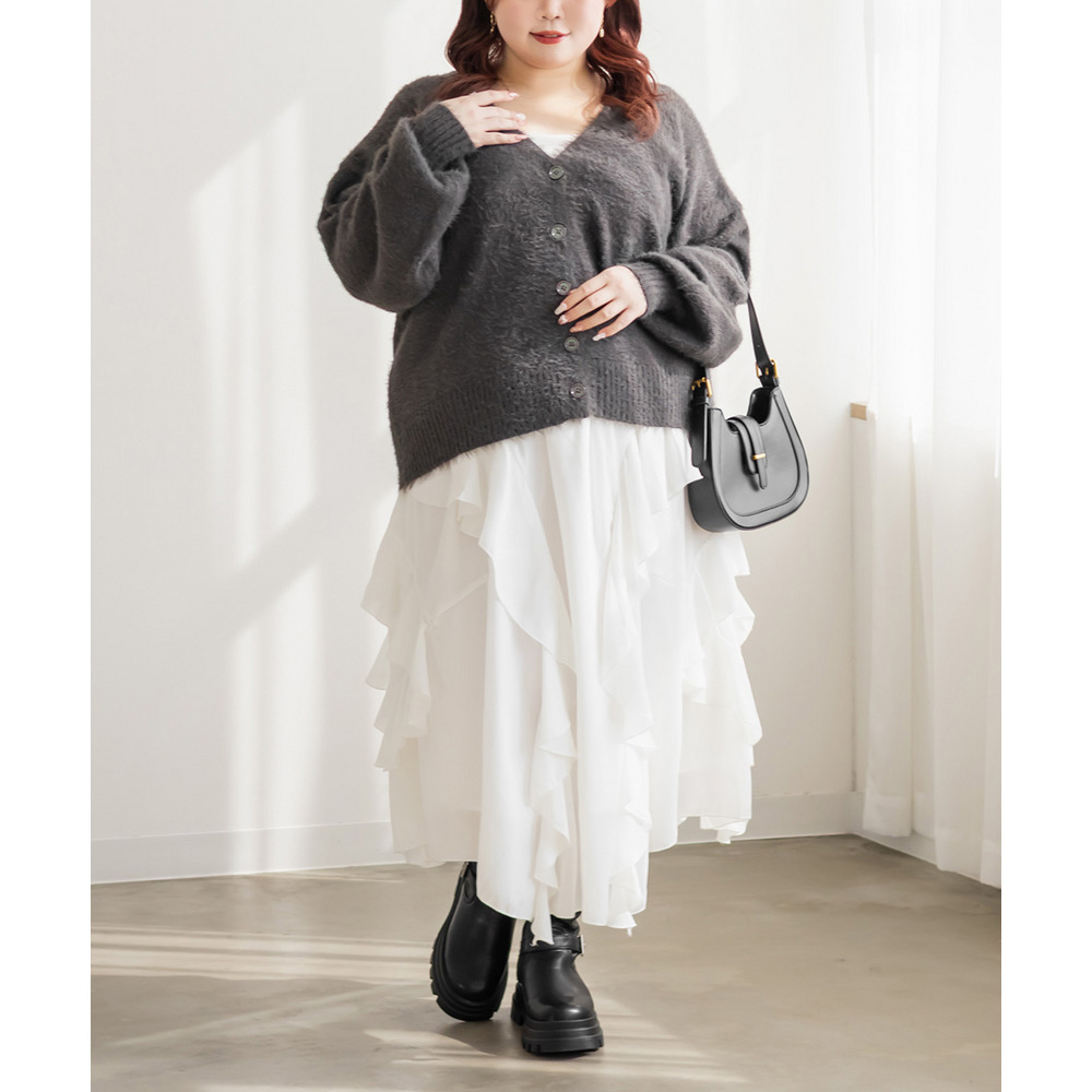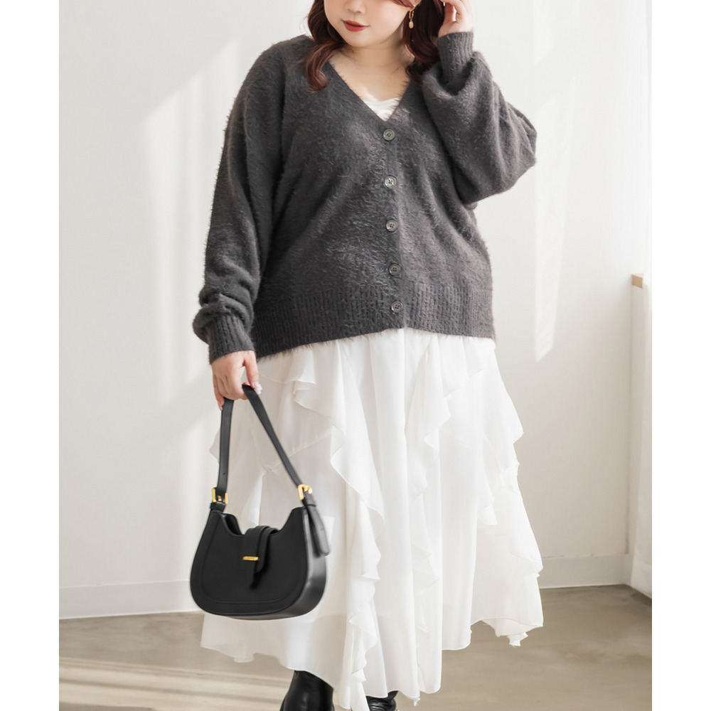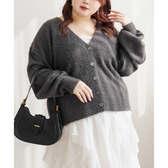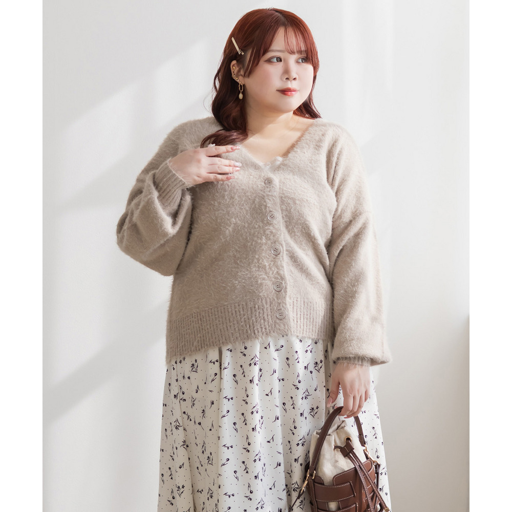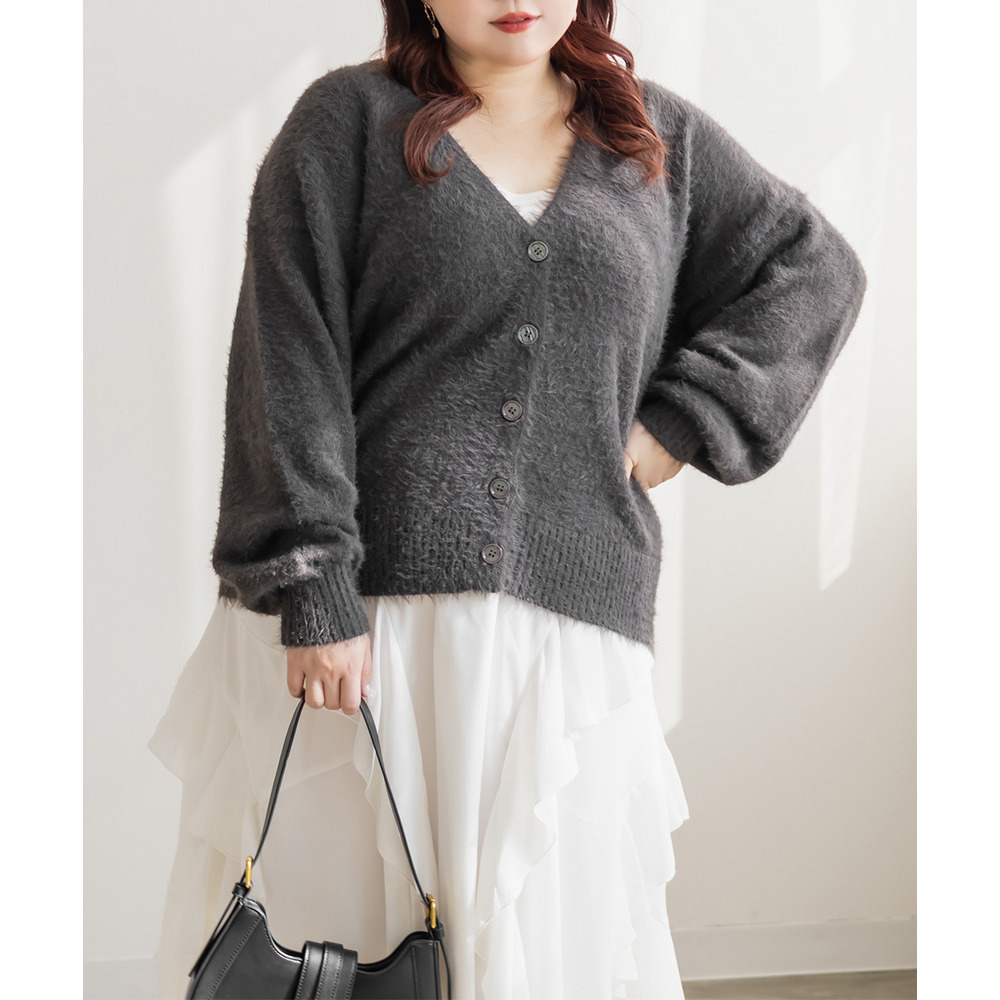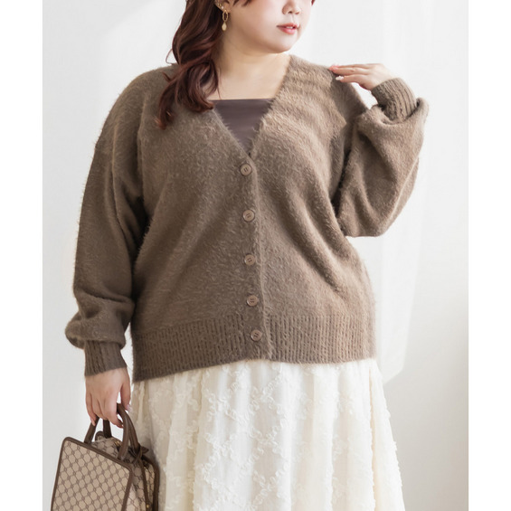 3Lを着てちょうどいいサイズで着ることが出来ました。シャギーがふわふわで着心地も気持ちの良いカーディガンです◎程よくゆとりのあるサイズ感だで、お尻周りを隠してくれる着丈で、カーデとしてもプルオーバーとしても使える便利な1枚です!Vネックで首元がすっきりと開いているから、シアーやタートルネックのインナーをレイヤードしても可愛いです!綺麗め・カジュアル・可愛い系どんなスタイルにも合わせやすい秋冬春と大活躍できる1枚です!
