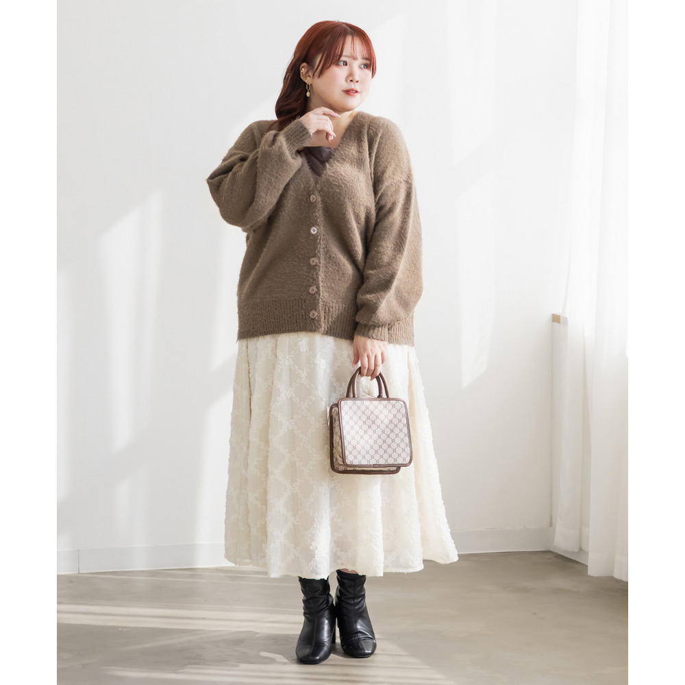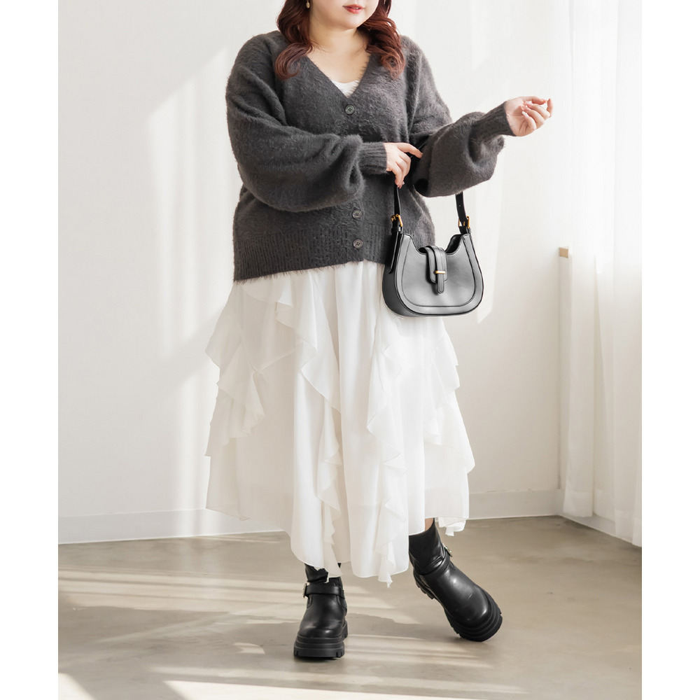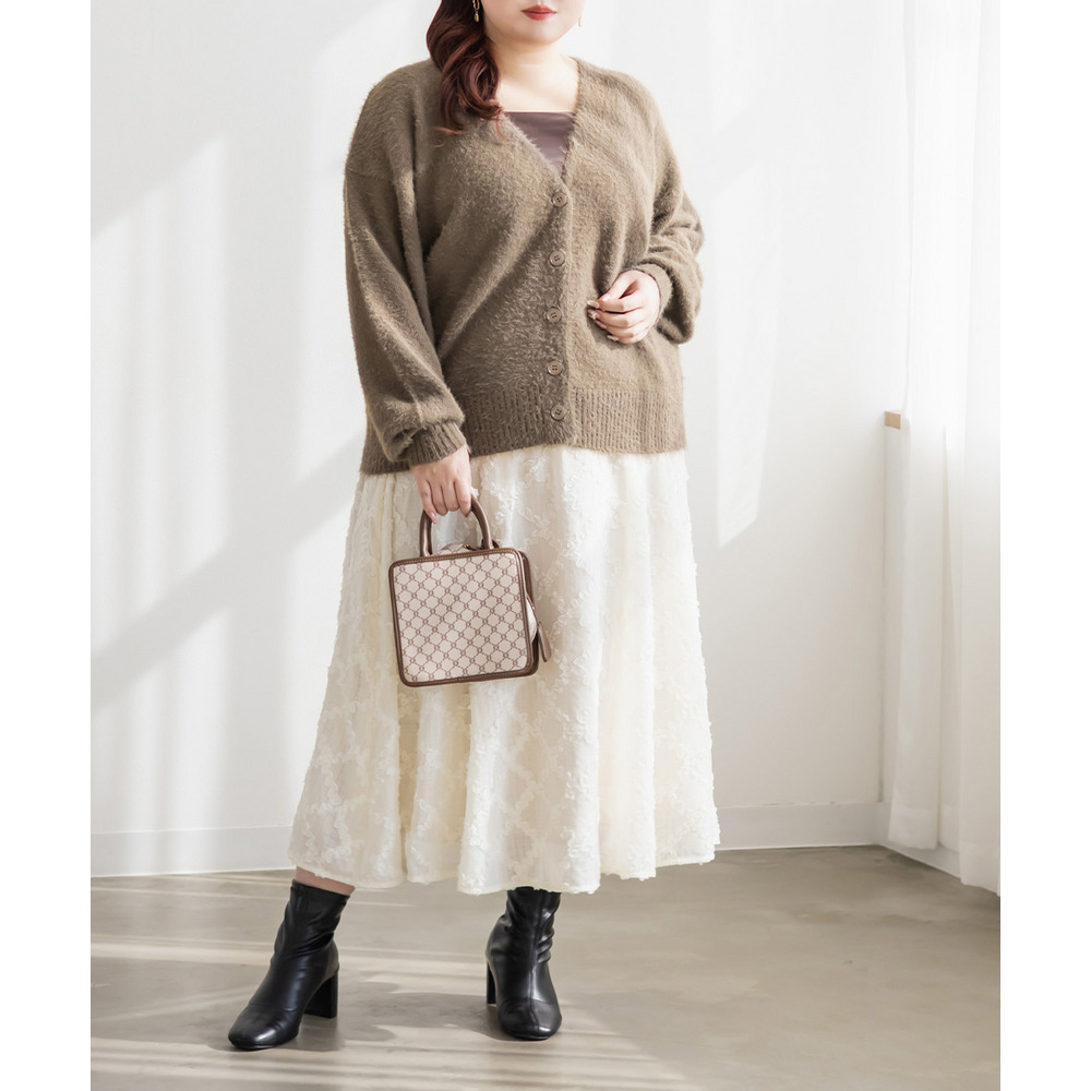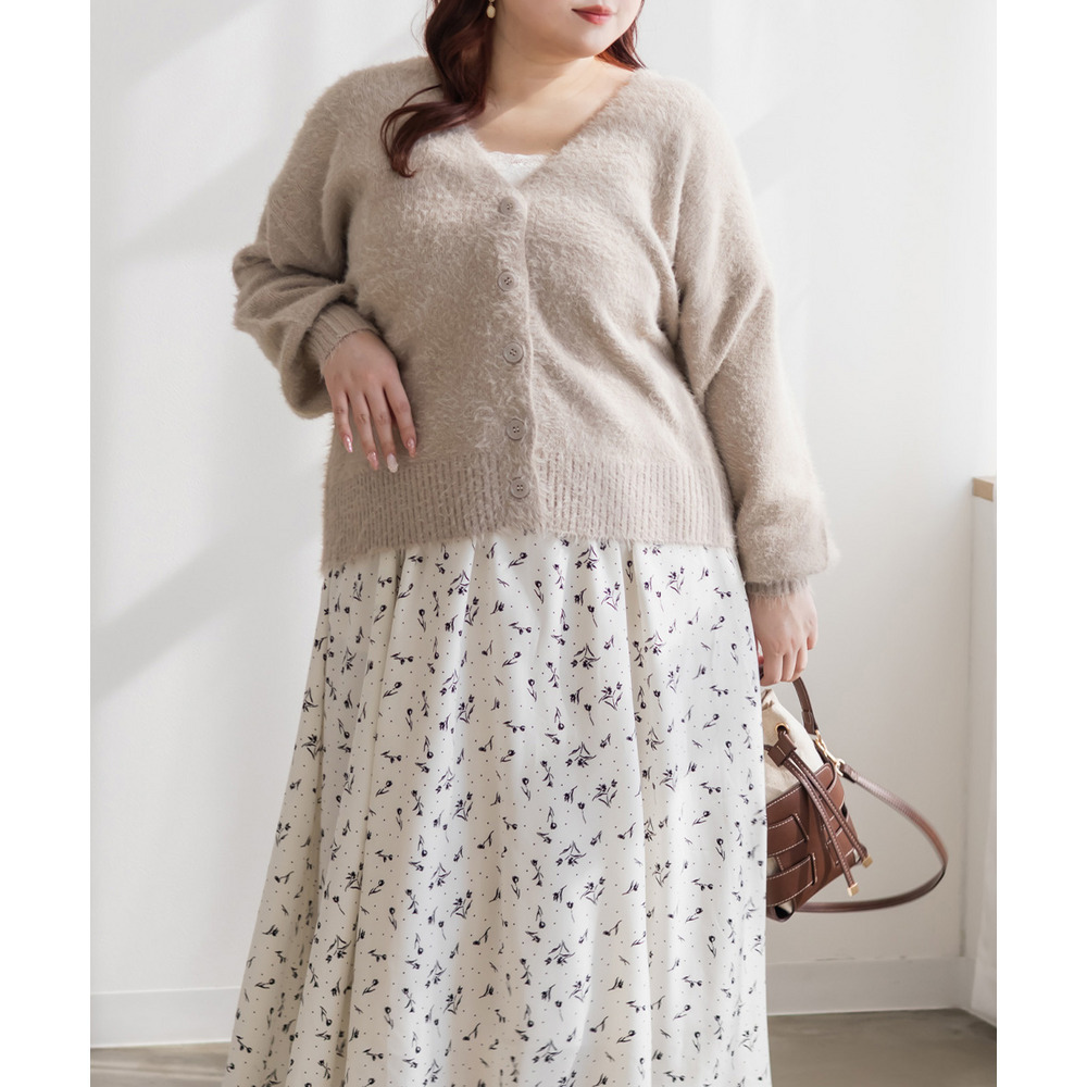 3Lを着てちょうどいいサイズで着ることが出来ました。シャギーがふわふわで着心地も気持ちの良いカーディガンです◎程よくゆとりのあるサイズ感だで、お尻周りを隠してくれる着丈で、カーデとしてもプルオーバーとしても使える便利な1枚です!Vネックで首元がすっきりと開いているから、シアーやタートルネックのインナーをレイヤードしても可愛いです!綺麗め・カジュアル・可愛い系どんなスタイルにも合わせやすい秋冬春と大活躍できる1枚です!