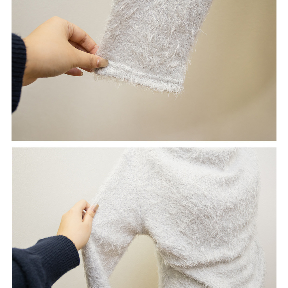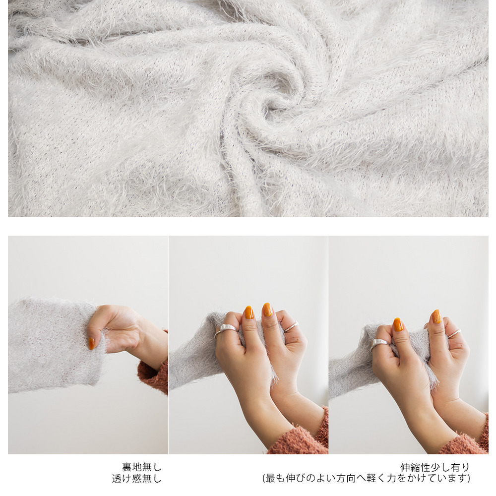 | 素材 | ■素材 ポリエステル98%、ポリウレタン2% ■裏地・透け感・伸縮性 裏地無し、透け感無し、伸縮性少し有り ■ポケット 無し ■生地感 毛足の長い柔らかなニット素材です。 |