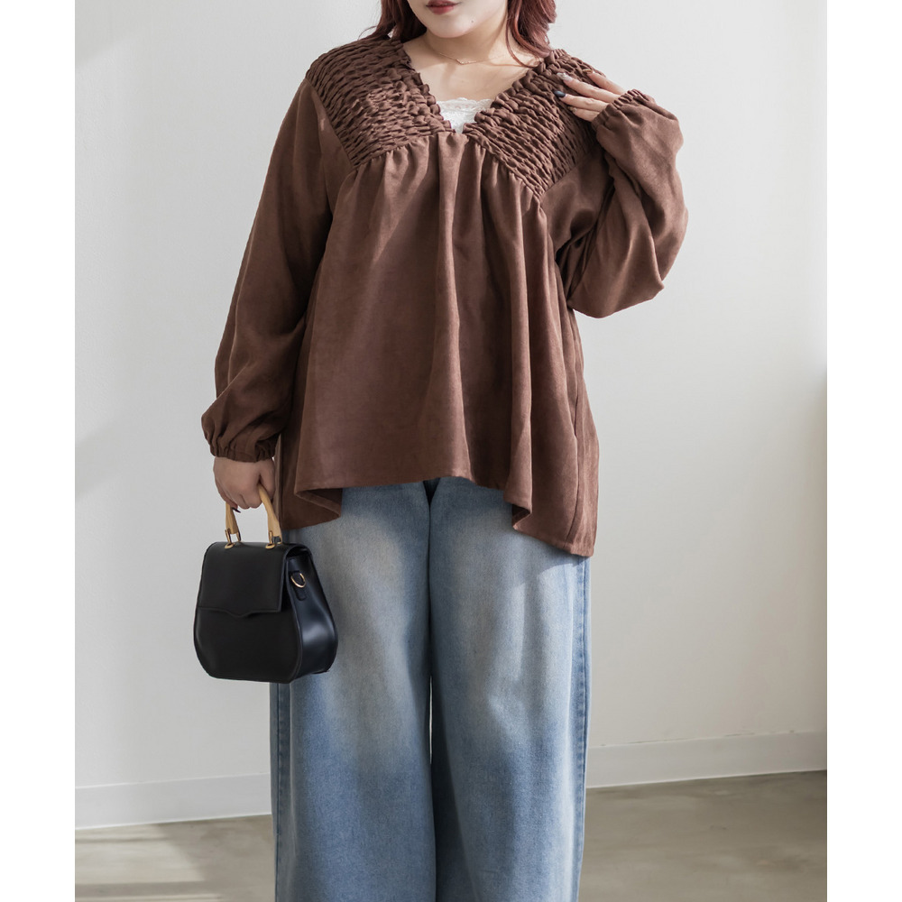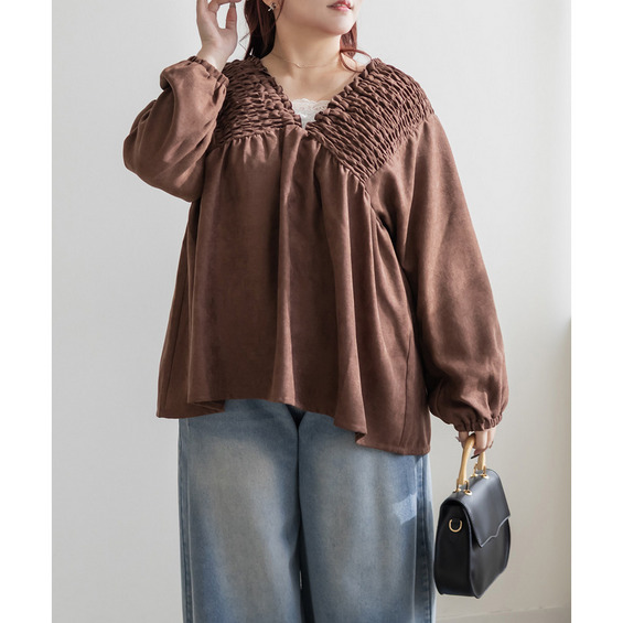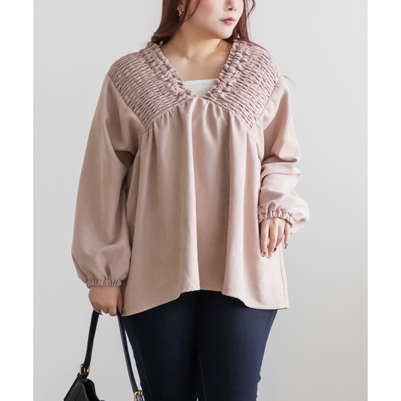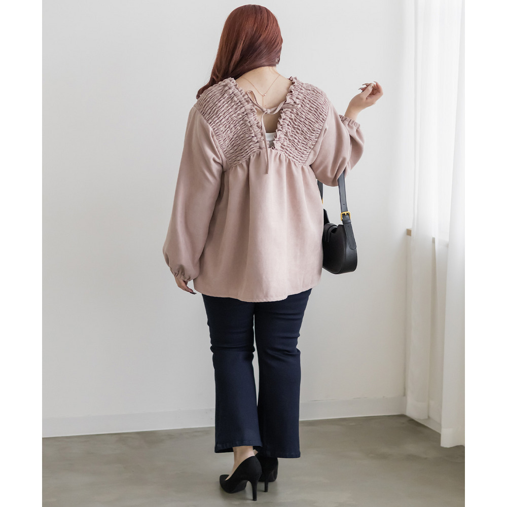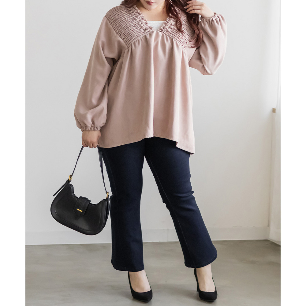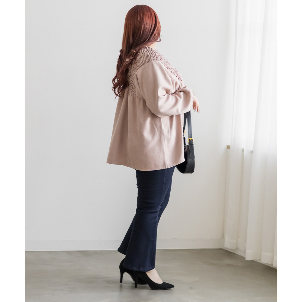 | 3Lサイズを着用してちょうどよい着心地で、ノンストレスに着用出来ました。シャーリングデザインがほどよくフィットして、自然に体のラインをきれいに見せてくれます♪ 生地は軽い秋冬らしい雰囲気で、柔らかい印象になれます!フレアシルエットで気になるお腹や腰まわりをふんわりカバーしてくれました◎ 着丈は長すぎないのでスカートにもパンツにもあわせやすいです♪ |