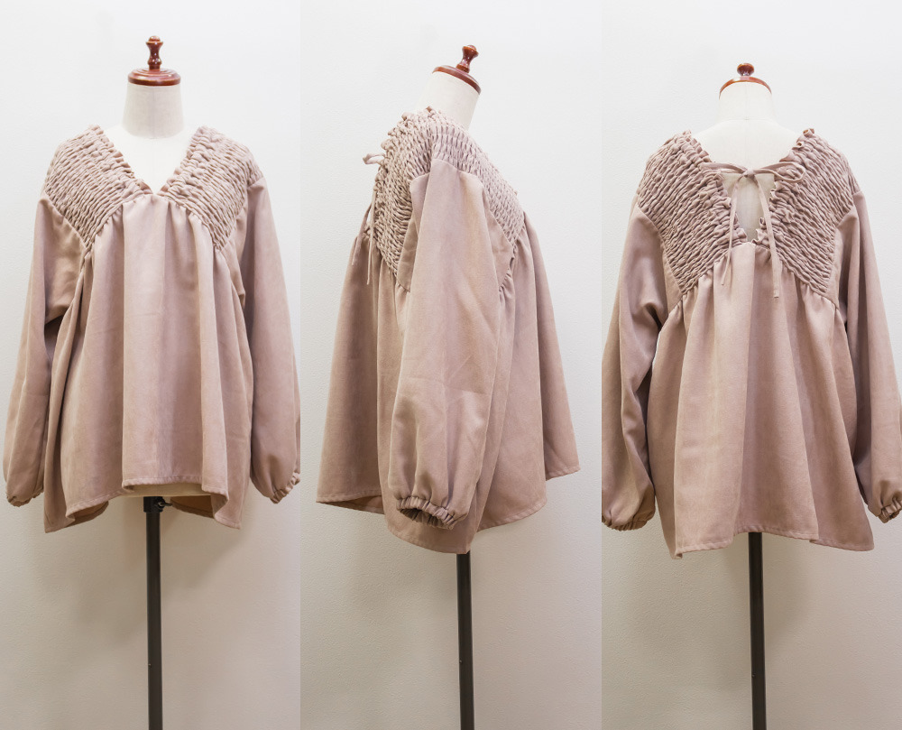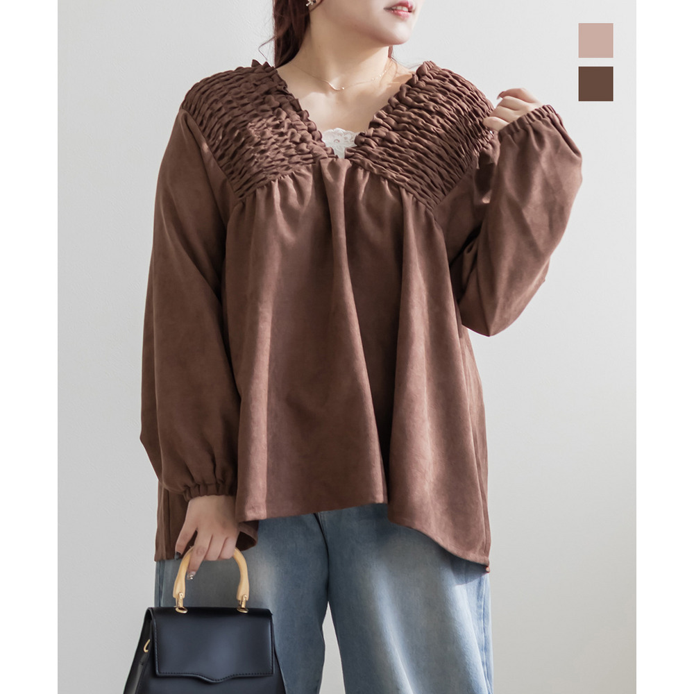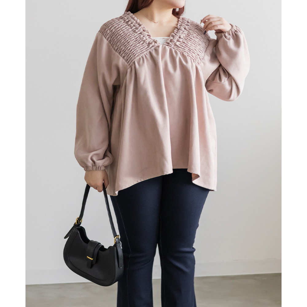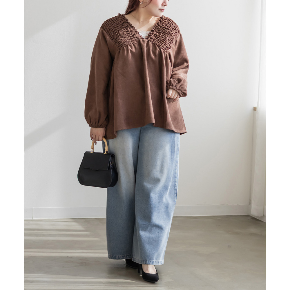 | 3Lサイズを着用してちょうどよい着心地で、ノンストレスに着用出来ました。シャーリングデザインがほどよくフィットして、自然に体のラインをきれいに見せてくれます♪ 生地は軽い秋冬らしい雰囲気で、柔らかい印象になれます!フレアシルエットで気になるお腹や腰まわりをふんわりカバーしてくれました◎ 着丈は長すぎないのでスカートにもパンツにもあわせやすいです♪ |