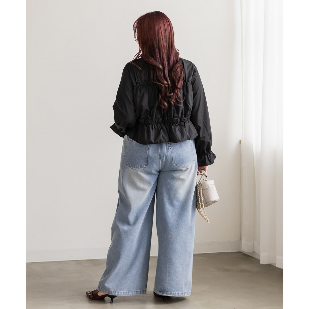 3Lサイズを着用して、ちょうどいいサイズ感でした。ウエスト部分のギャザーが程よくフィットし、メリハリのあるシルエットに♪ ふんわりとしたキャンディースリーブとフリルデザインが華やかで、シンプルなボトムスと合わせるだけで存在感のあるコーデが完成します。丈感はやや短めなので、ハイウエストのパンツやスカートと相性◎ きちんと感がありながらも、程よい甘さのあるデザインなので、大人フェミニンなスタイルにぴったりな一枚です。