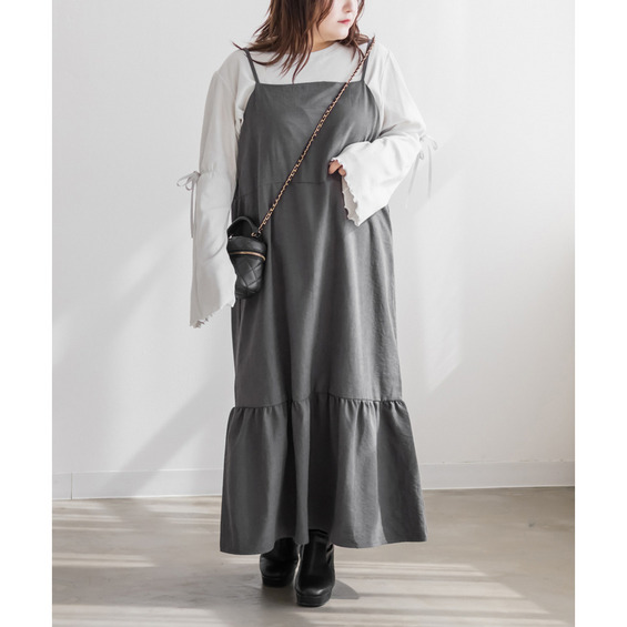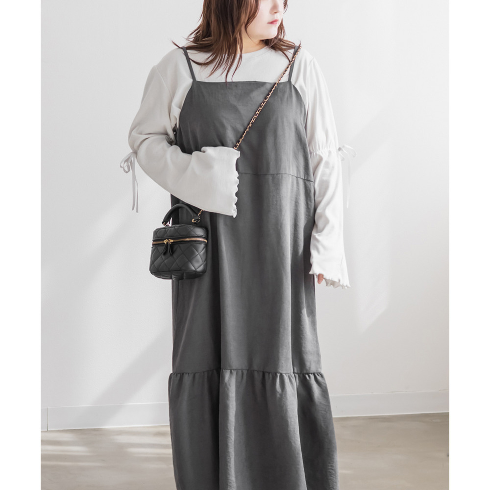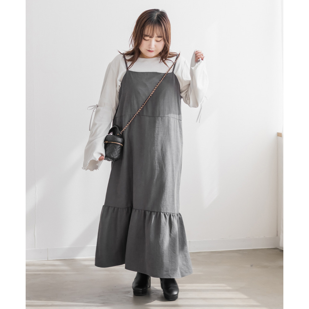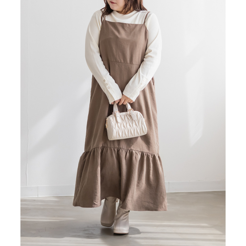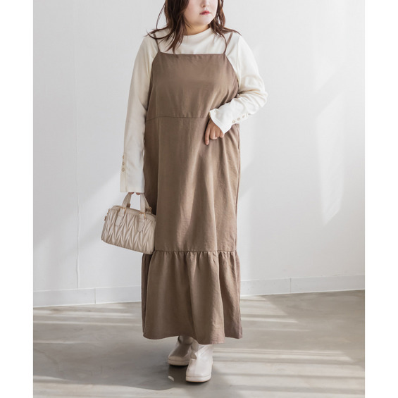 | 3Lサイズを着用しました。少しゆとりのあるサイズ感で、いつもの3Lサイズよりは小さめだったのでサイズ確認をお勧めします!ゴムのないすっきりした仕様だったのでワンサイズ大きくてもいいかもしれないです◎肩紐は調節できる仕様です。秋冬らしい生地で、季節感たっぷりだけど、厚みが無く軽く楽に着用出来ました!すっきりとしたシルエットで、裾の切替からひらひら広がるのが可愛いです!インナー次第で長く使えてお勧めです! |