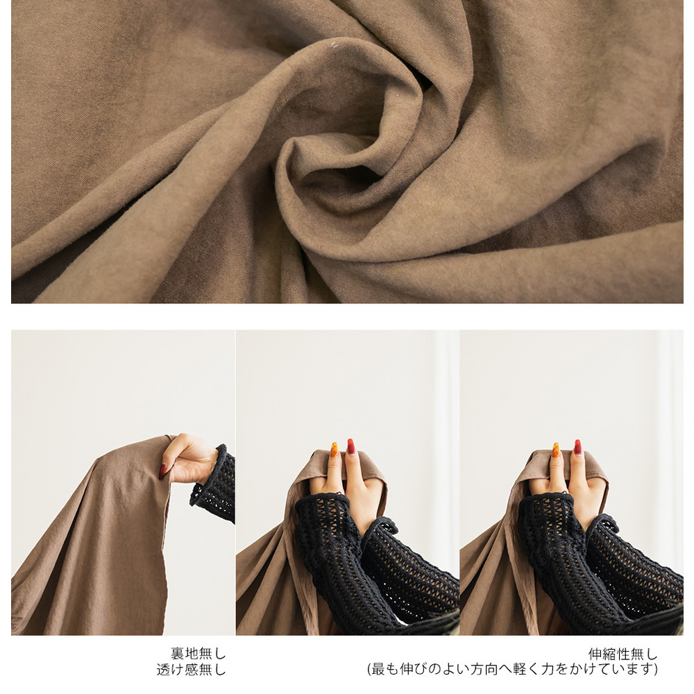 | 素材 | ■素材 ポリエステル95%、ナイロン5% ■裏地・透け感・伸縮性 裏地無し、透け感無し、伸縮性無し ■ポケット 無し ■生地感 薄手のスエード素材です。 |
