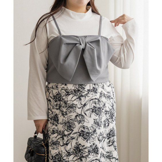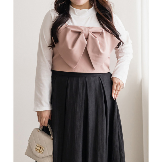 | 3Lサイズを着用していつもどおりのサイズ選びで問題なさそうでした!ビスチェは後ろゴム入りだけど生地自体は伸びないのでバストサイズの確認をお勧めします◎トップスとビスチェのセットでそれぞれ別のアイテムと合わせて着ても可愛いです!トップスはリブカットソーでらくちんな着心地です!大きめのリボンが目を惹くアイテムで、ガーリーなスタイルになれちゃう1枚です!ビスチェと同じ生地のパンツとセットアップで着てもお洒落な雰囲気になれてお勧めです♪ |