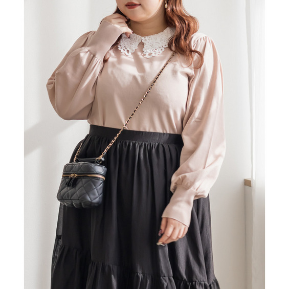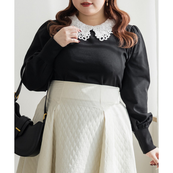 | 3Lサイズでちょうどいいサイズ感でした。体にフィットしすぎないシルエットだからボディラインを拾いません。窮屈感なく上品な配色襟は2枚重ねになっていて、さりげないけど凝ったデザイン!二の腕をカバーして、てくびはすっきりと締めてくれる袖デザインも可愛いです。1枚でレイヤード風の着こなしができるので、トップスにインしてもごわつかないのが嬉しいです。 |