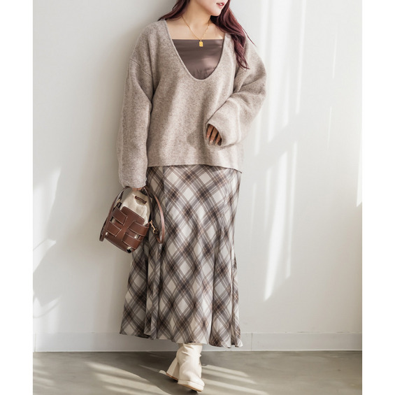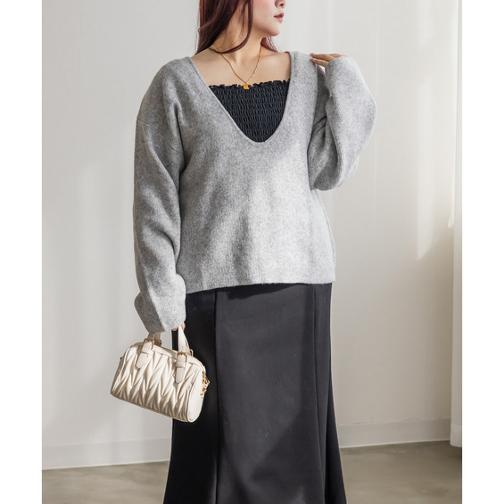 | 3Lサイズを着て、ゆったりとしたオーバーサイズのシルエットで、体のラインを拾わずに着られるところがお気に入りです♪首元はUネックで抜け感がありつつ、大人カジュアルでお洒落な印象です◎お尻まですっぽり隠れる丈感だから、細身のボトム合わせもバランスよく楽しめました!こなれた印象になるので、1枚持っていると着回しに大活躍してくれるニットです! |