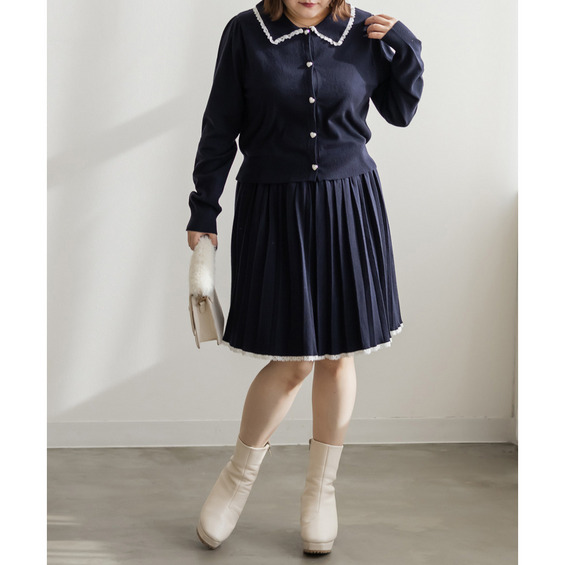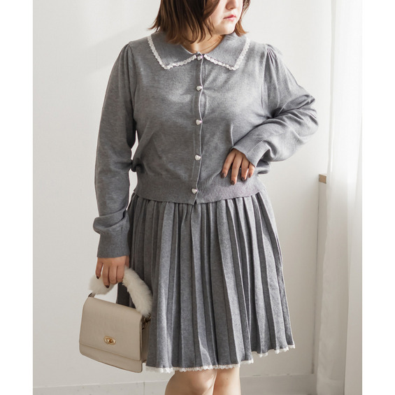 3Lサイズを着て、少しゆとりのあるサイズ感でした。バストのサイズ確認をお勧めします!カーデとスカートのセットで、襟元とスカートの裾にはレースがついているのがさりげなく可愛いです!カーデのボタンはハート型になっているのがポイント!スカートはニットのプリーツミニスカートで、セットだけじゃなく色々なアイテムと合わせやすいです◎それぞれ単品使いで色々なスタイリングが楽しめます。これから季節のデートやお出かけにお勧めです♪