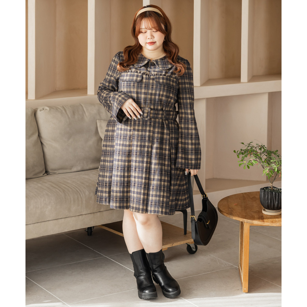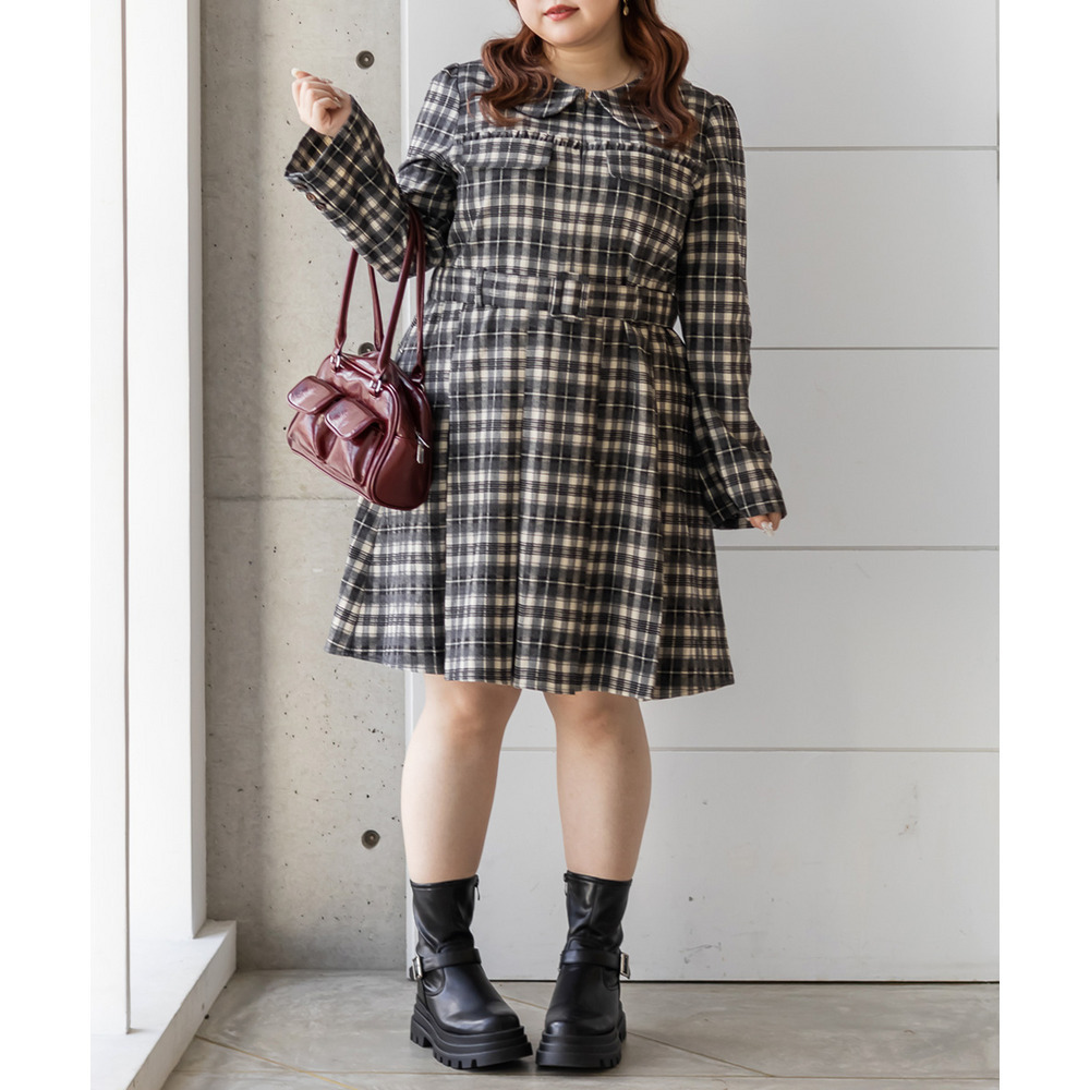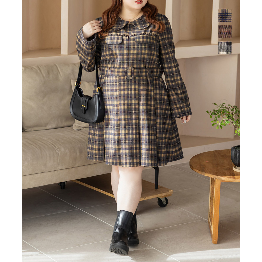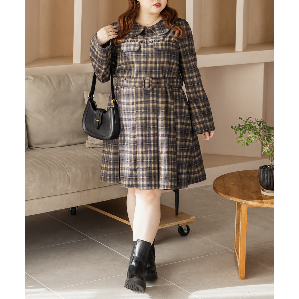 | 3Lサイズを着用していつも通りのサイズ感でした!チェック柄がレトロで可愛くて、1枚でしっかり着映えするワンピースです♪視線が上に集まるデザインなので自然とスタイルアップして見えるのが嬉しいポイント。ウエストベルトでメリハリが出て、体のラインは拾いにくく着用感はちょうどいいです。生地もしっかりしていて安心感があり、ロングシーズン着られそう◎ブーツで大人っぽくまとめたり、靴下合わせでカジュアルにしたりと、雰囲気を変えて楽しめる1枚です♪ |
