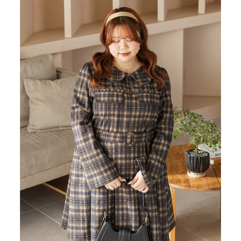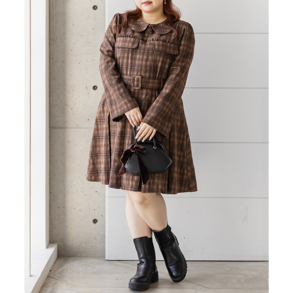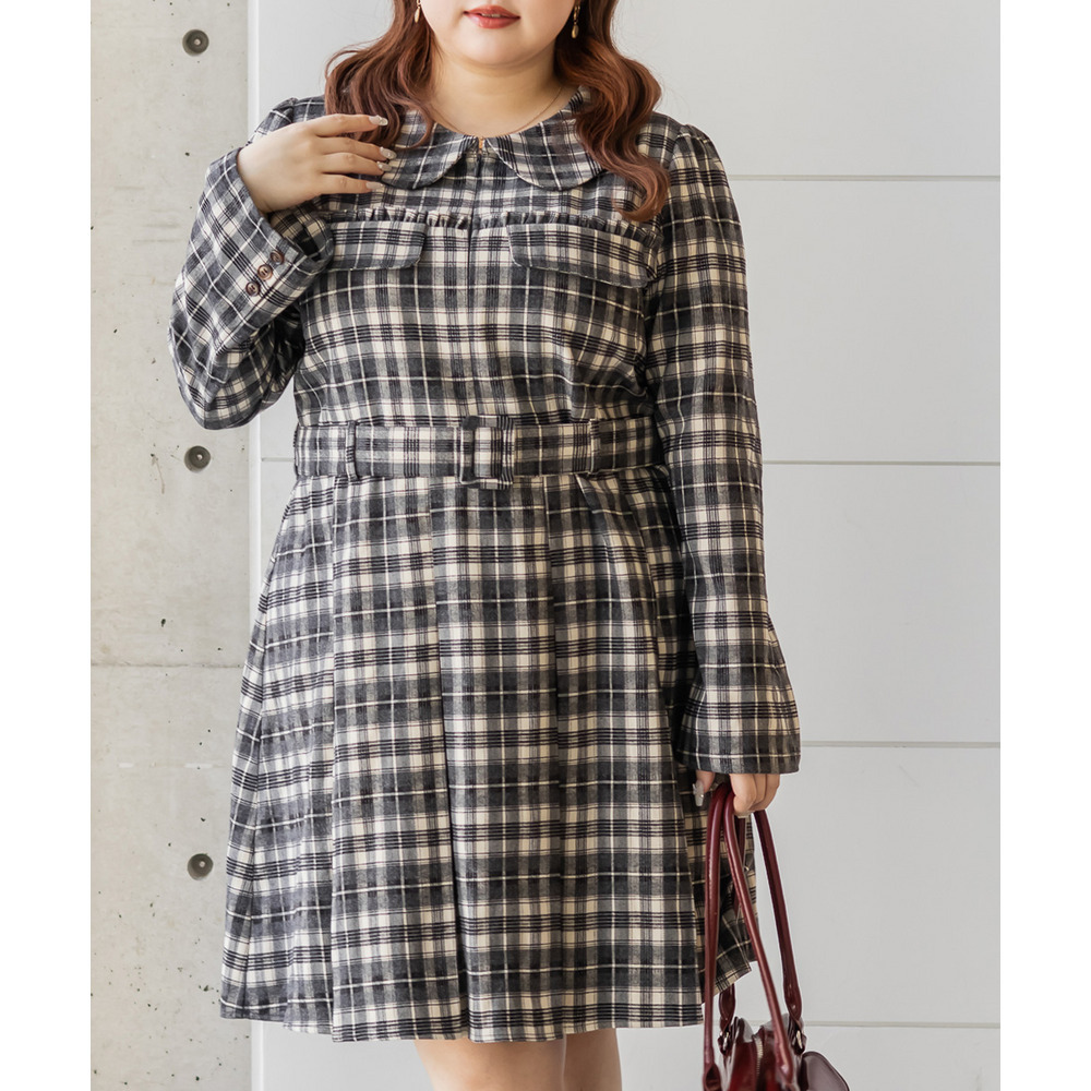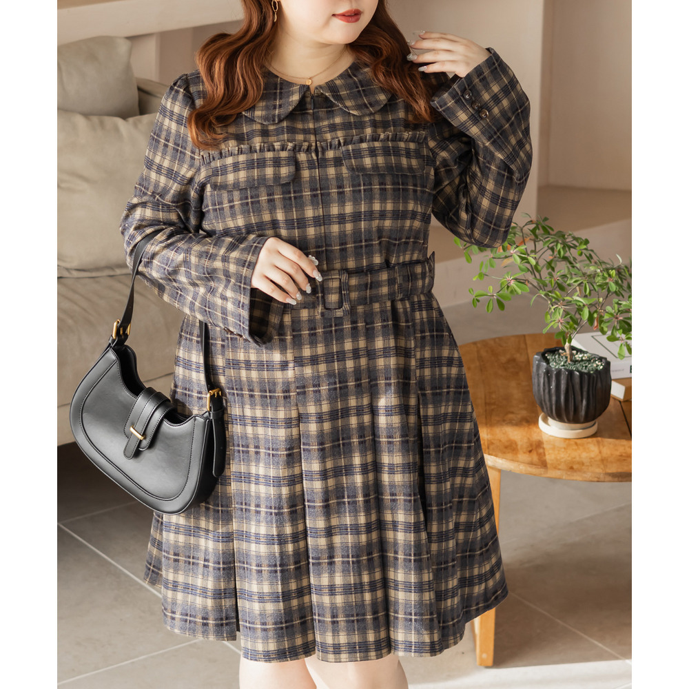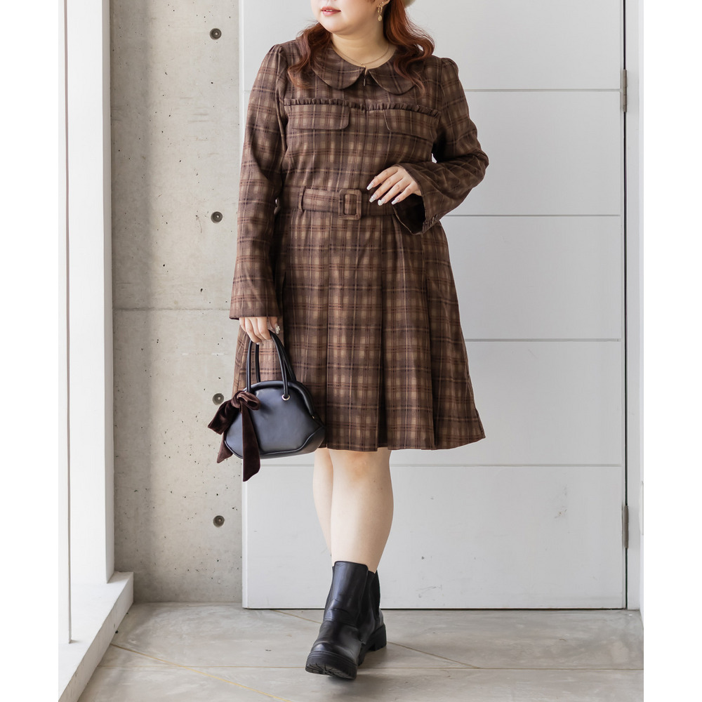 | 3Lサイズを着用していつも通りのサイズ感でした!チェック柄がレトロで可愛くて、1枚でしっかり着映えするワンピースです♪視線が上に集まるデザインなので自然とスタイルアップして見えるのが嬉しいポイント。ウエストベルトでメリハリが出て、体のラインは拾いにくく着用感はちょうどいいです。生地もしっかりしていて安心感があり、ロングシーズン着られそう◎ブーツで大人っぽくまとめたり、靴下合わせでカジュアルにしたりと、雰囲気を変えて楽しめる1枚です♪ |