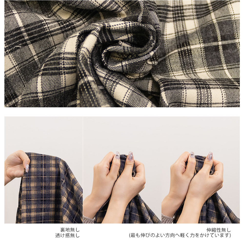 | 素材 | ■素材 ポリエステル67%、レーヨン30%、ポリウレタン3% ■裏地・透け感・伸縮性 裏地無し、透け感無し、伸縮性無し ■ポケット 無し ■生地感 しっかりとした厚みがありながら、やわらかく心地よい肌触りの素材です。 |