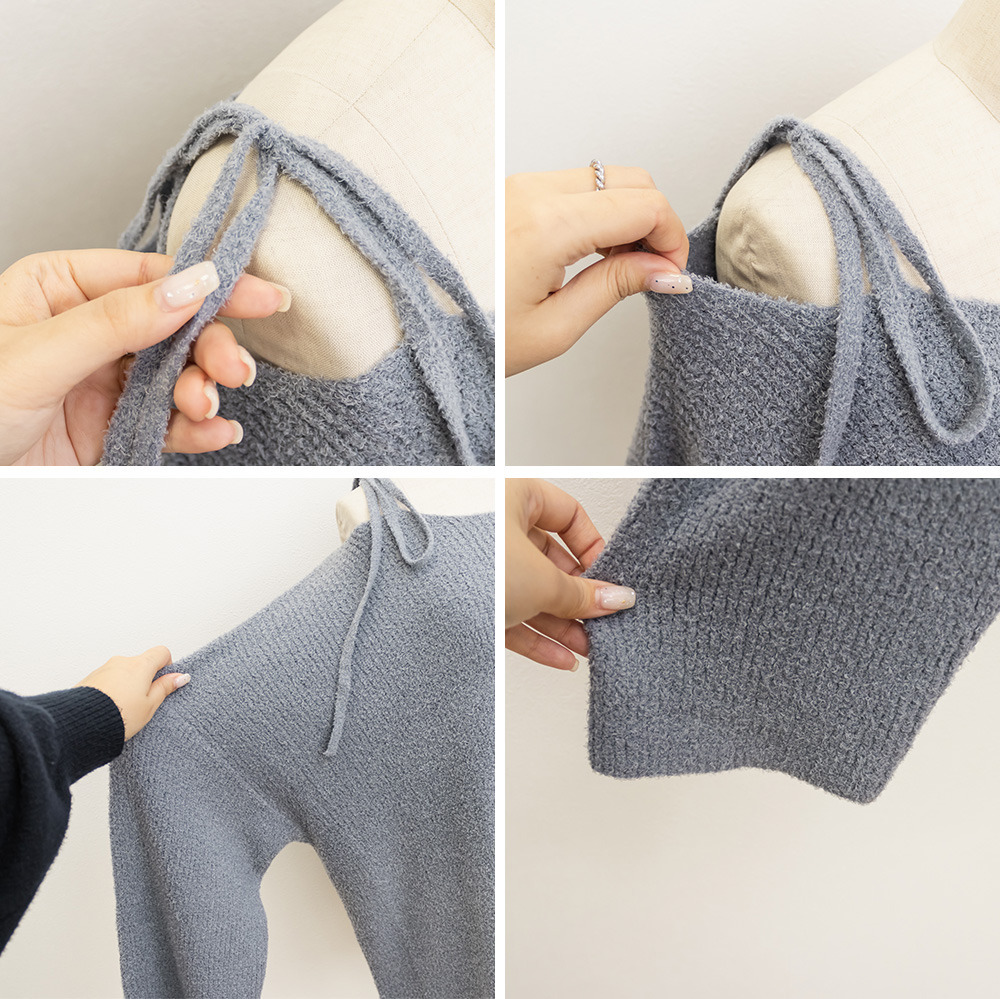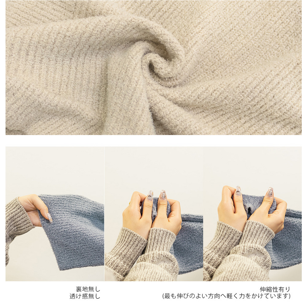 | 素材 | ■素材 ナイロン81%、ポリエステル19% ■裏地・透け感・伸縮性 裏地無し、透け感無し、伸縮性有り ■ポケット 無し ■生地感 ふわふわとした少しだけ起毛感のある糸を使った柔らかなニット素材。 |