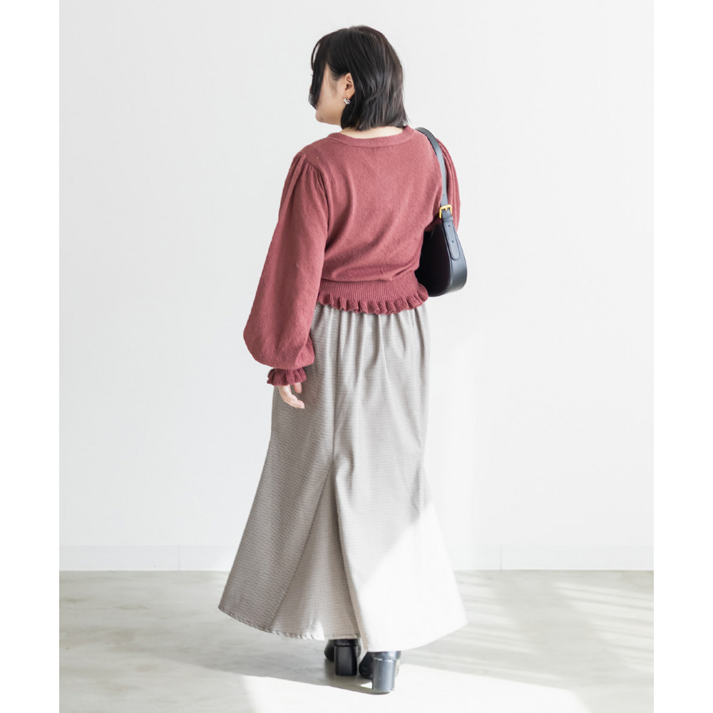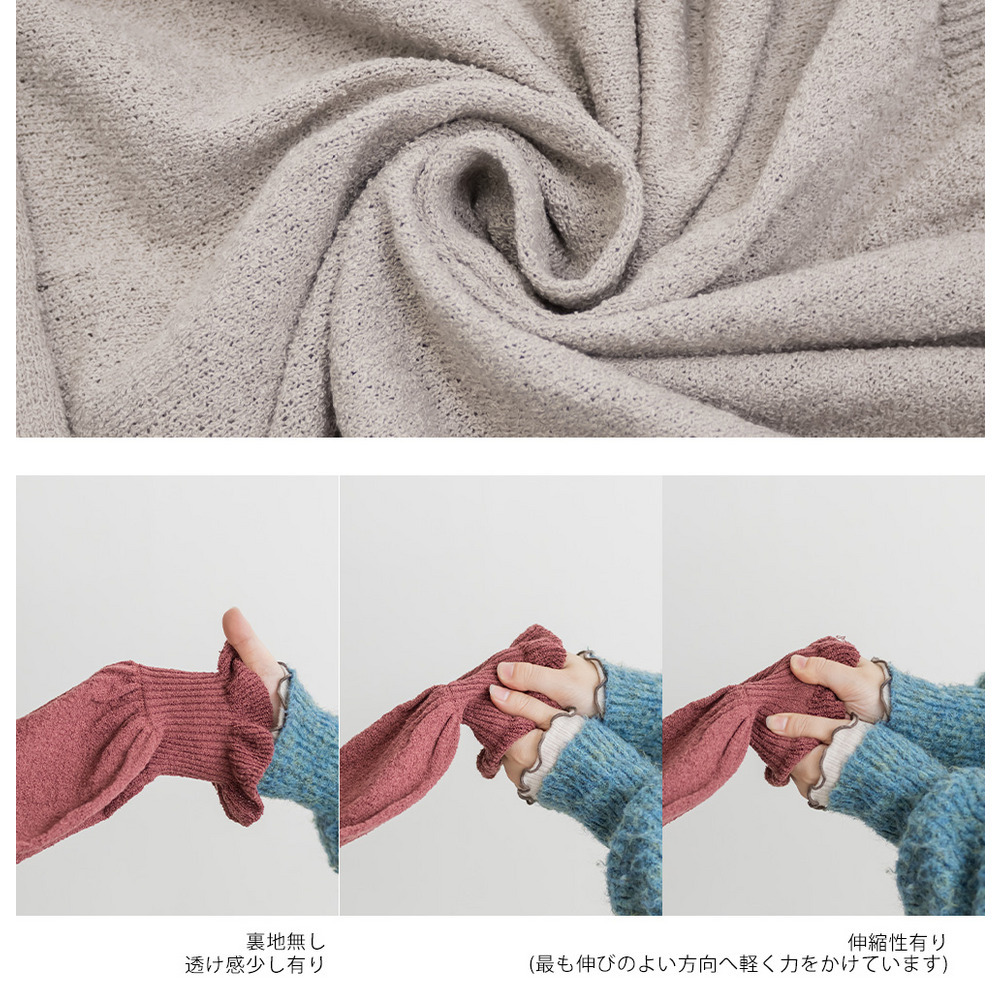 | 素材 | ■素材 ポリエステル100% ■裏地・透け感・伸縮性 裏地無し、透け感少し有り、伸縮性有り ■ポケット 無し ■生地感 やや透け感のあり、程よく伸縮性のあるニット素材です。 |