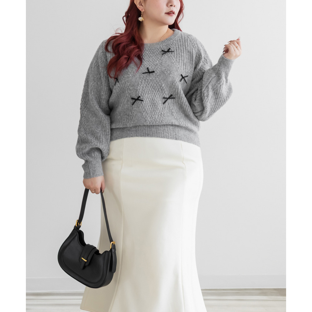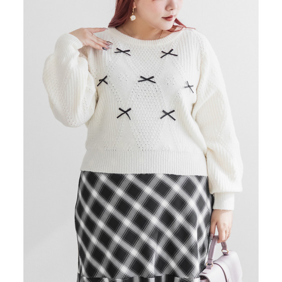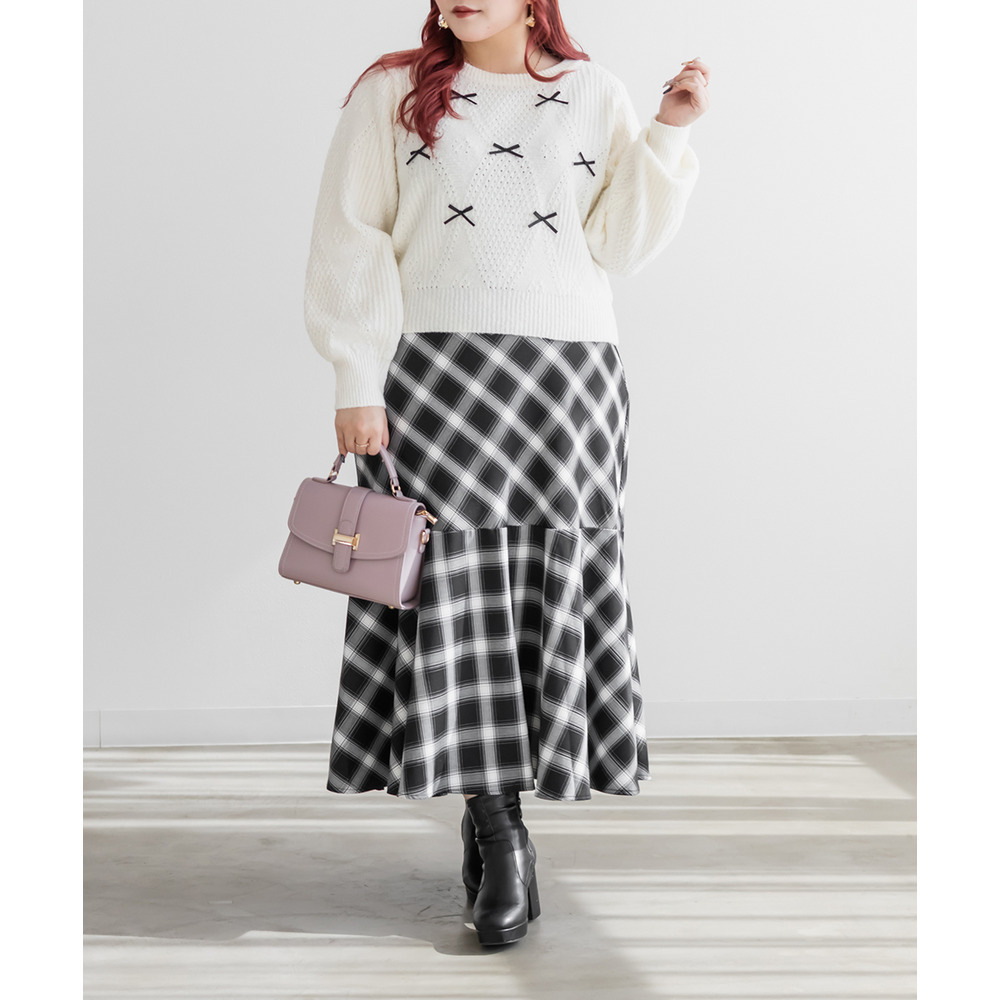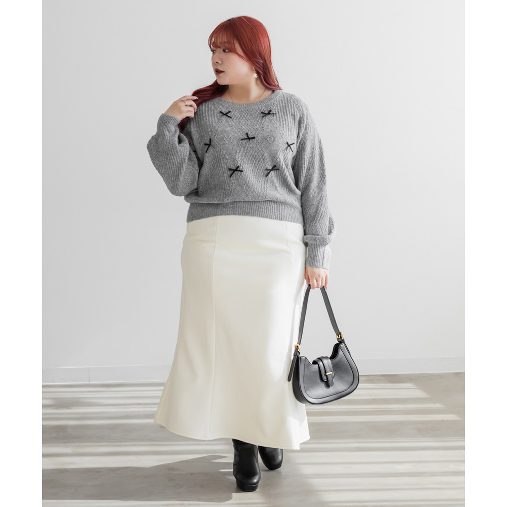 | 3Lサイズを着用してちょうどいいサイズ感でした。程よい丈感でトップスインしなくても着られるのが魅力です◎リボンがたくさんあしらわれたデザインで、ガーリーコーデにぴったり!1枚でかわいくなれるので、シンプルなボトムスとコーデするのがおすすめ!コートなどのアウターとも重ねやすいです! |