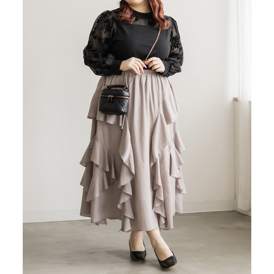3Lサイズを着用しました。ウエストは総ゴム仕様でラクに履けてちょうどよかったです◎ラッフルデザインが歩くたびにひらっと揺れて、女性らしさをしっかり演出してくれます。ロング丈なので気になる足元もカバーしつつ、縦のラインを強調してくれるのでスタイルアップ効果も♪シンプルなトップスを合わせるだけで華やかになるので、普段使いはもちろん、ちょっとしたお出かけにもぴったりでした。
