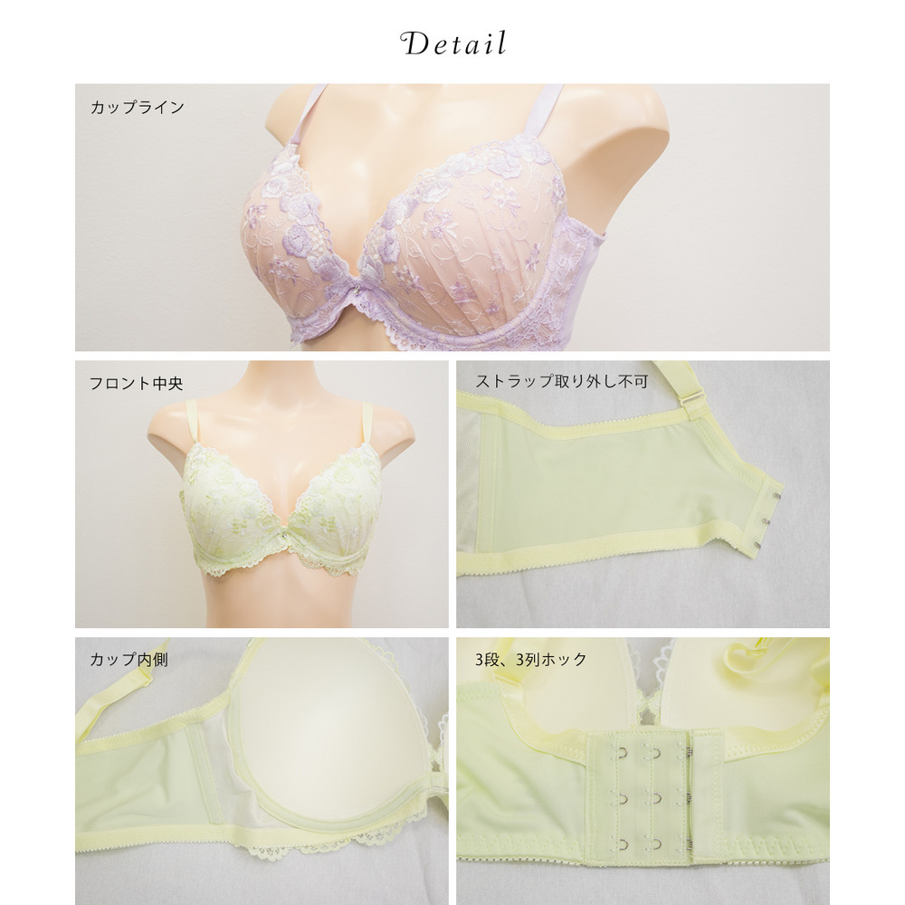 素材 ■素材 ポリエステル、ナイロン、その他 ■裏地・透け感・伸縮性 裏地無し、透け感有り、伸縮性有り ■その他 【カップタイプ】3/4カップ・モールドカップ(丸みを形成した厚みのあるカップです)、【ホックの数】3段3列、【パット付属】なし、【パットポケット】なし、【ストラップ取外し】不可、【ワイヤー】あり、※タンブル乾燥禁止