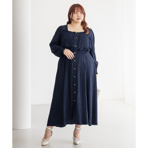 | 3Lサイズを着用して窮屈感のない楽な着心地でした!ウエストや袖はゴム入りで締め付け感も無かったです◎軽やかな生地感なのもかわいいし動きやすいです。フロントはティアードデザインでふんわりと広がるシルエットがとてもかわいく、体のラインを拾わず安心して着られます♪フロントのボタンがアクセントになっていて、1枚でコーデが完成する主役級ワンピースです。丈感もしっかりあり、大人っぽさもありながら甘すぎないデザインなので、シーンを選ばず着られるのが嬉しいです! |