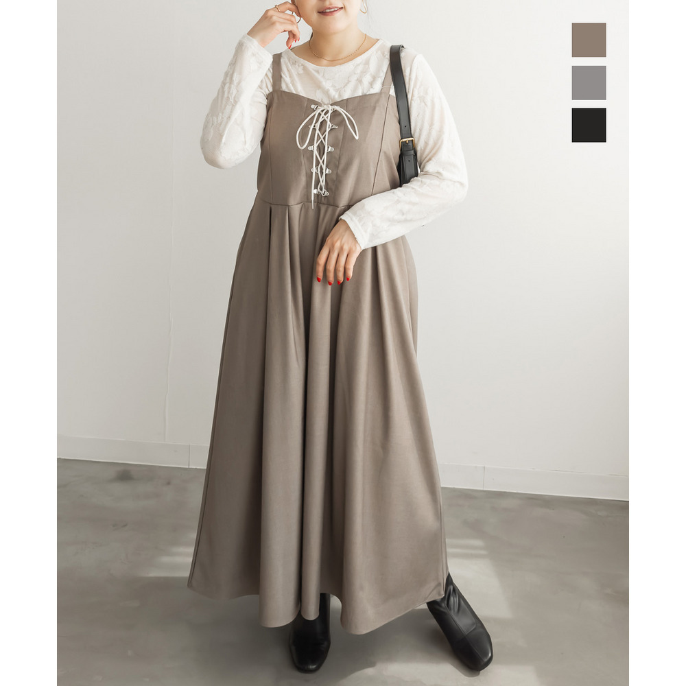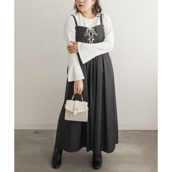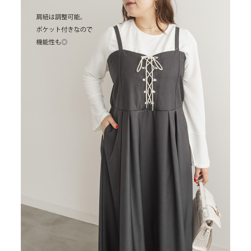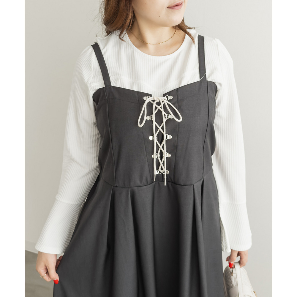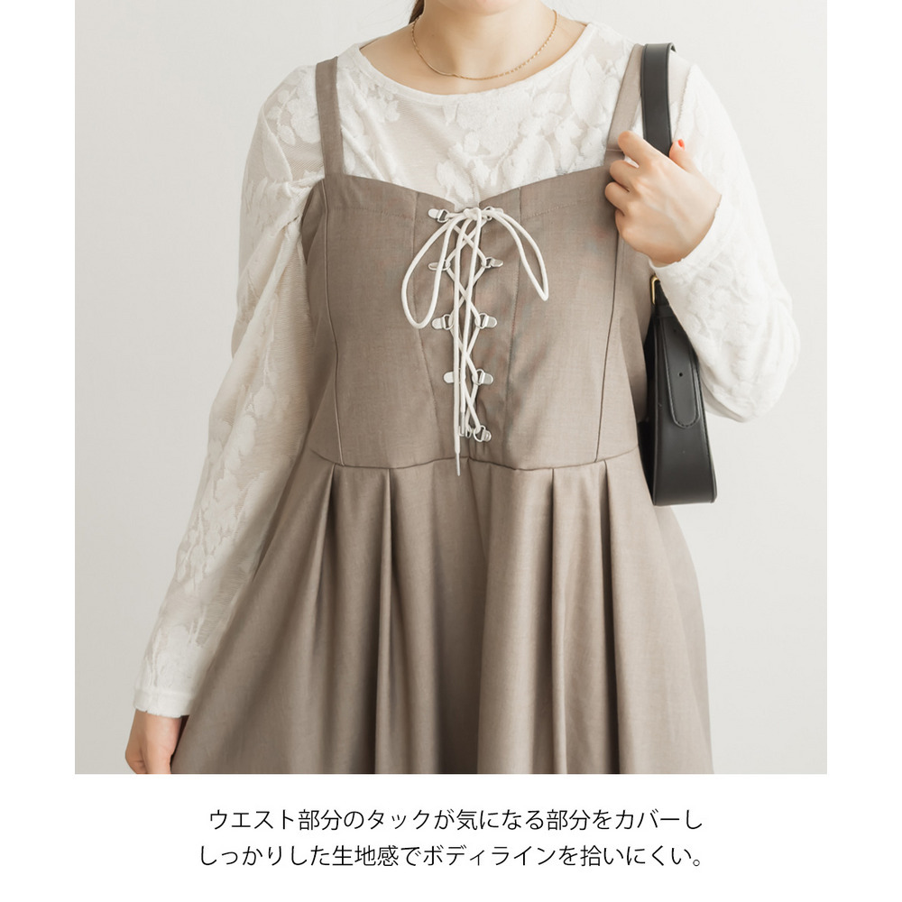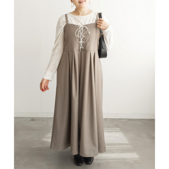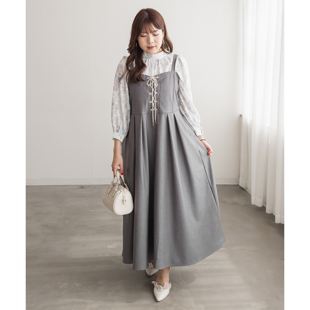 3Lを着てちょうどいいサイズでした。後ろゴムだったり楽に着られる仕様だったので着やすい1枚です◎上半身部分はすっきりとしていながら、スカート部分は綺麗に広がるからフィット&フレアですっきり着やせできます!少しハリのある生地なのでボディラインを拾いずらいのも嬉しい!レースアップデザインで甘くなりすぎずに、おしゃれ感も楽しめるワンピースなのでインナーを変えて色々な着こなしを楽しめそうです! |