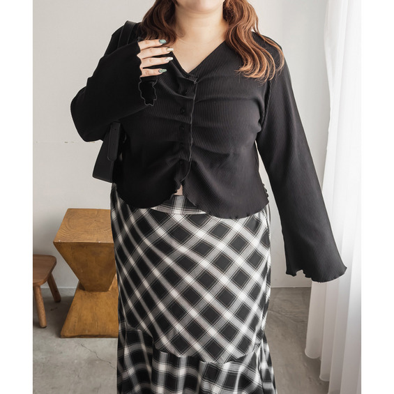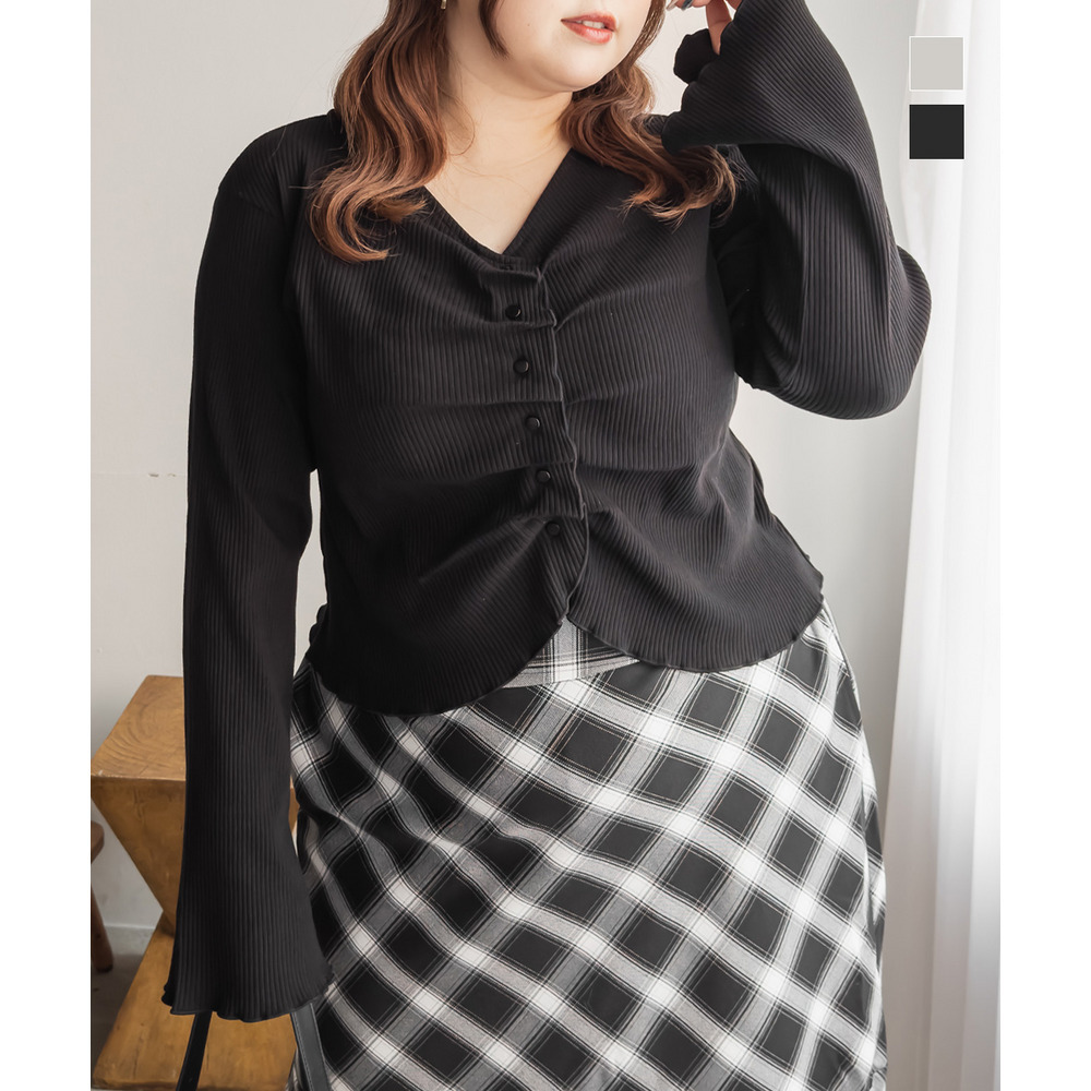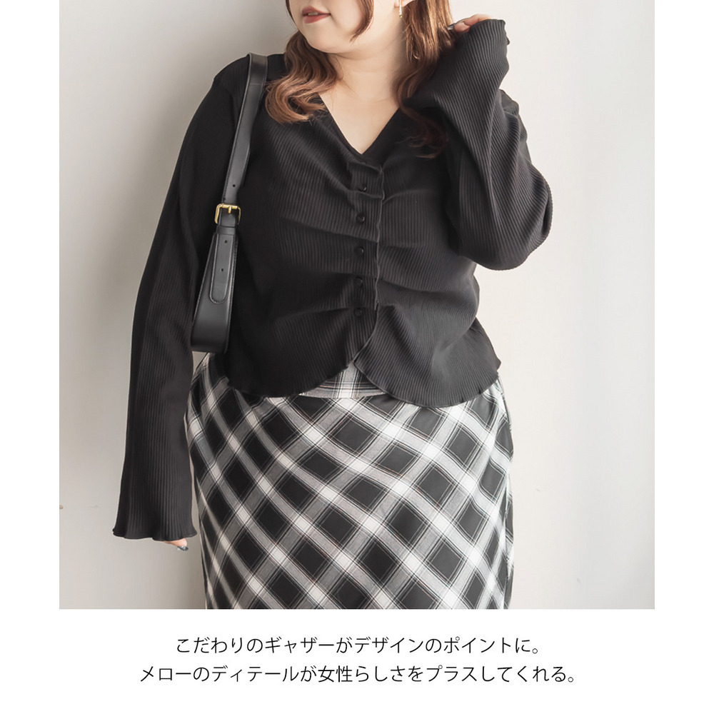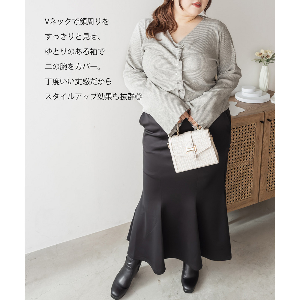 3Lサイズを着用してちょうどいいサイズ感でした。首元がすっきり開いていて華奢な印象で着用出来ました◎リブカットソーでらくちんなのはもちろん、メリハリのある縦のラインが強調出来て着やせして見えます!他にないデザインで抜け感があり今っぽい1枚です!ボディラインをカバーしてくれるギャザーたっぷりのデザインが今っぽさと着痩せを両立してくれます♪丈感も丁度良くタックインせずにバランスよく着られます!コーデしやすいのでい1枚で映えるアイテムで、前開きなのでカーデとして秋~春とながく使えるのでパンツやスカートと合わせてたくさん着たいアイテムです! |