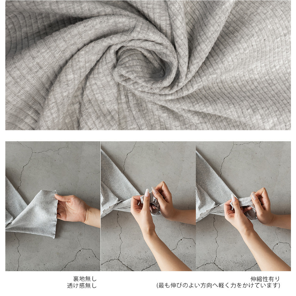 素材 | ■素材 綿94%、ポリウレタン6% ■裏地・透け感・伸縮性 裏地無し、透け感無し、伸縮性有り ■ポケット 無し ■生地感 程よく伸縮性のある柔らかなリブ仕様のカットソー素材です。 |