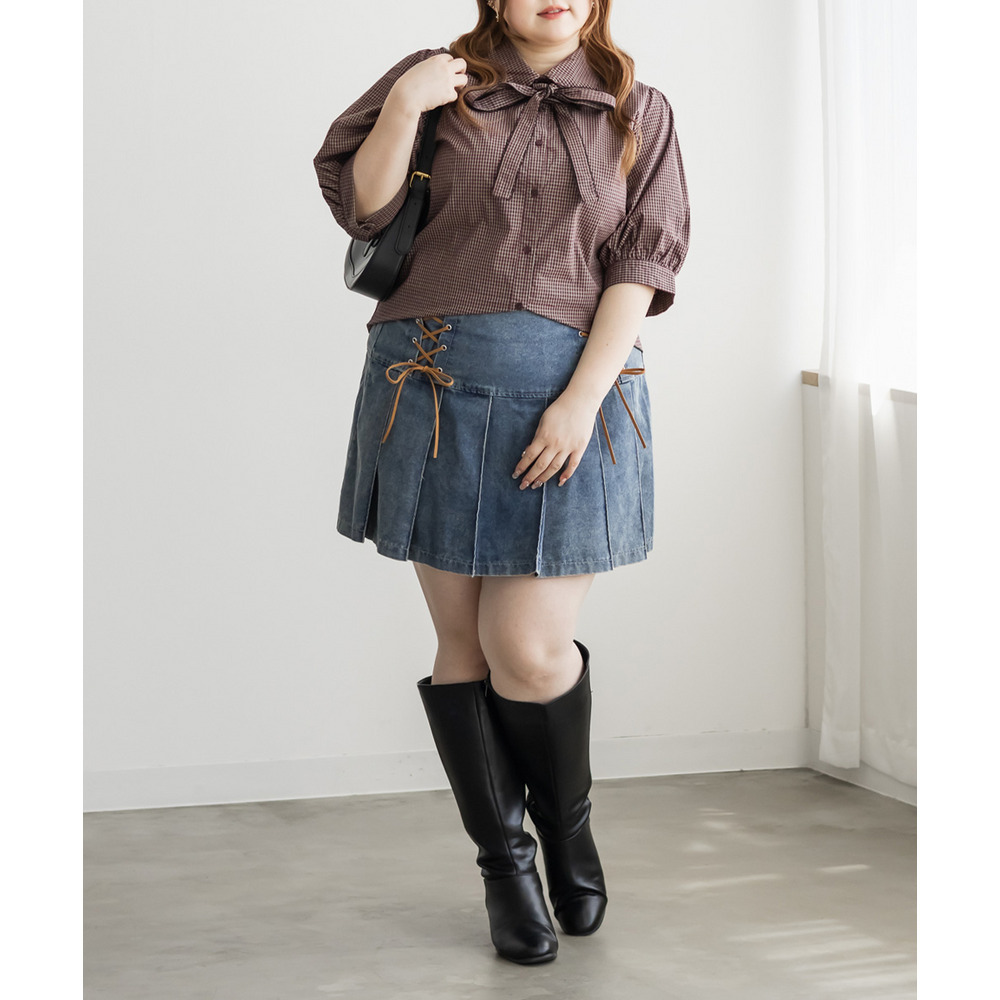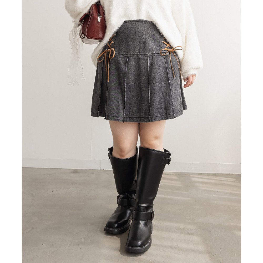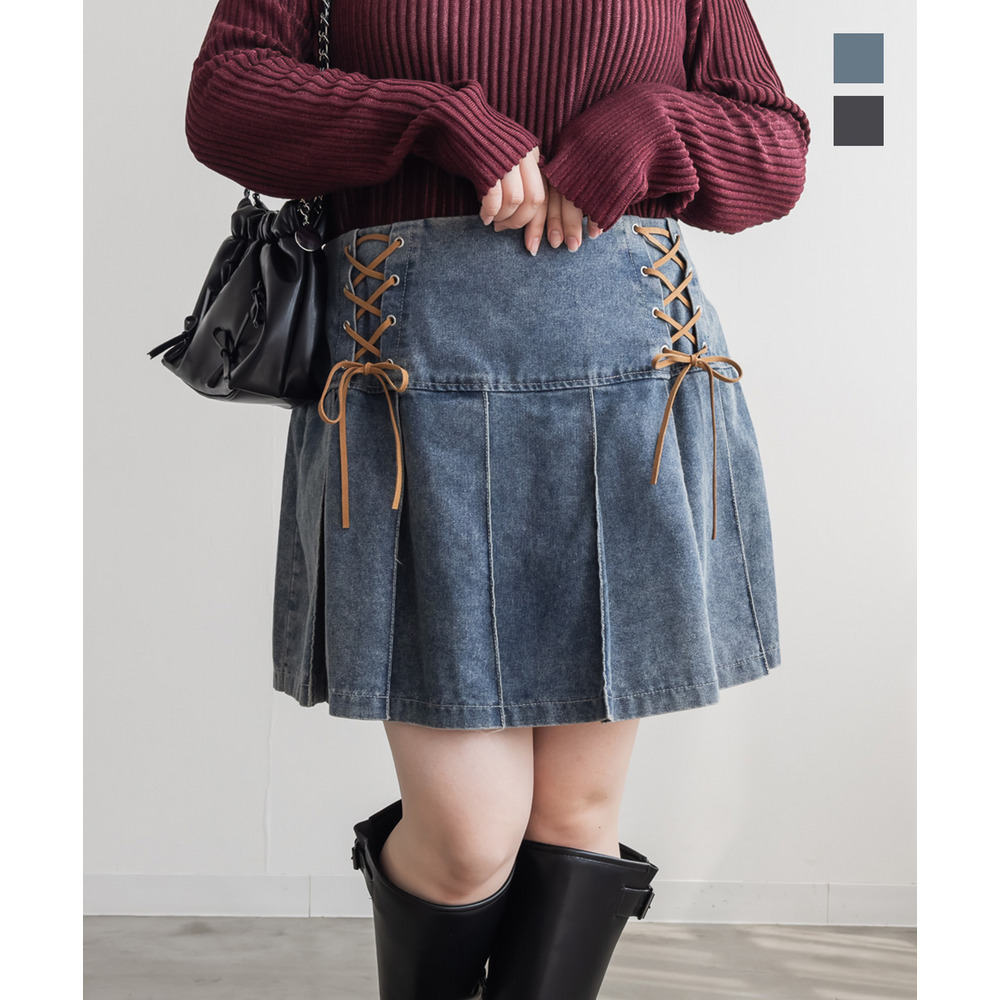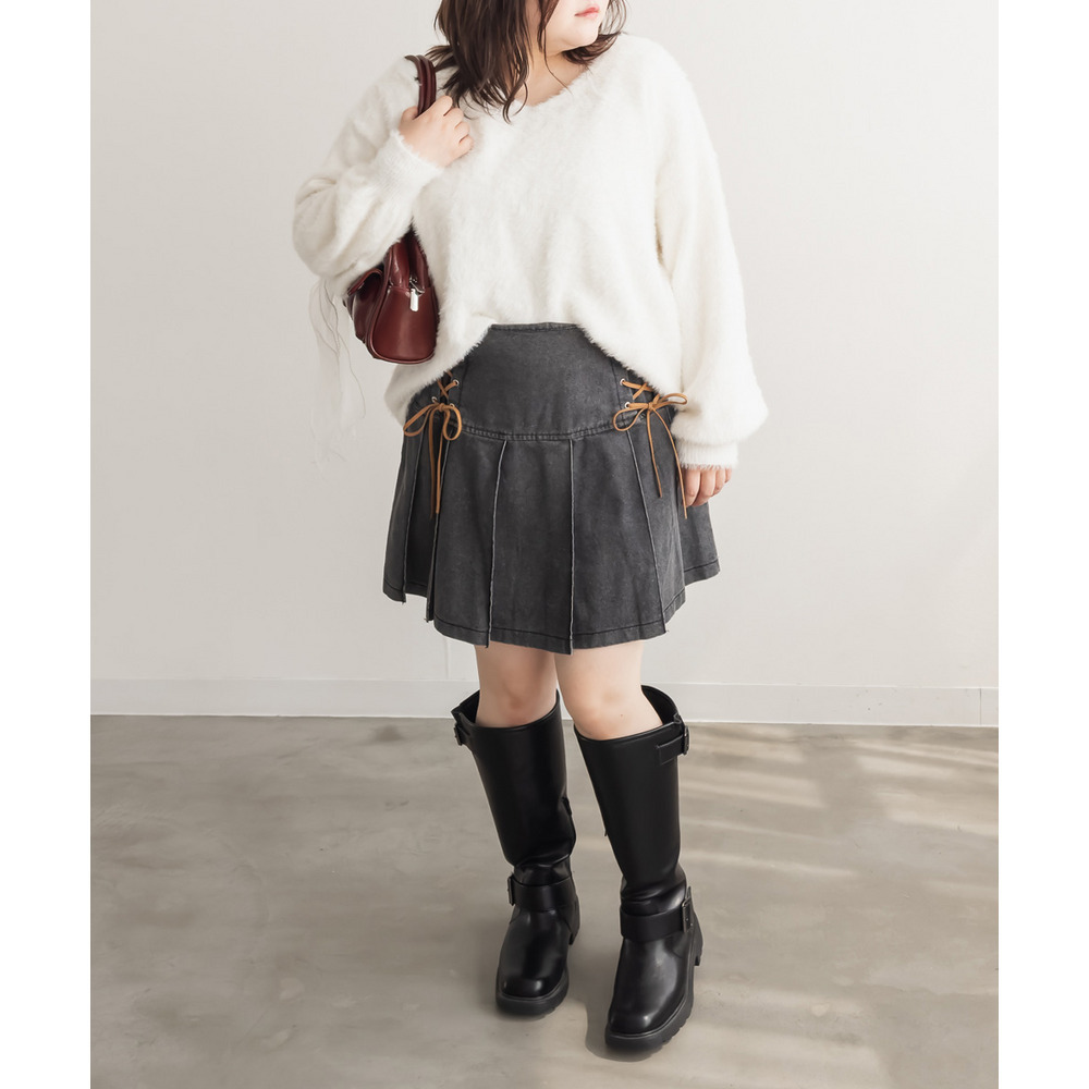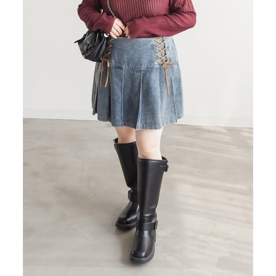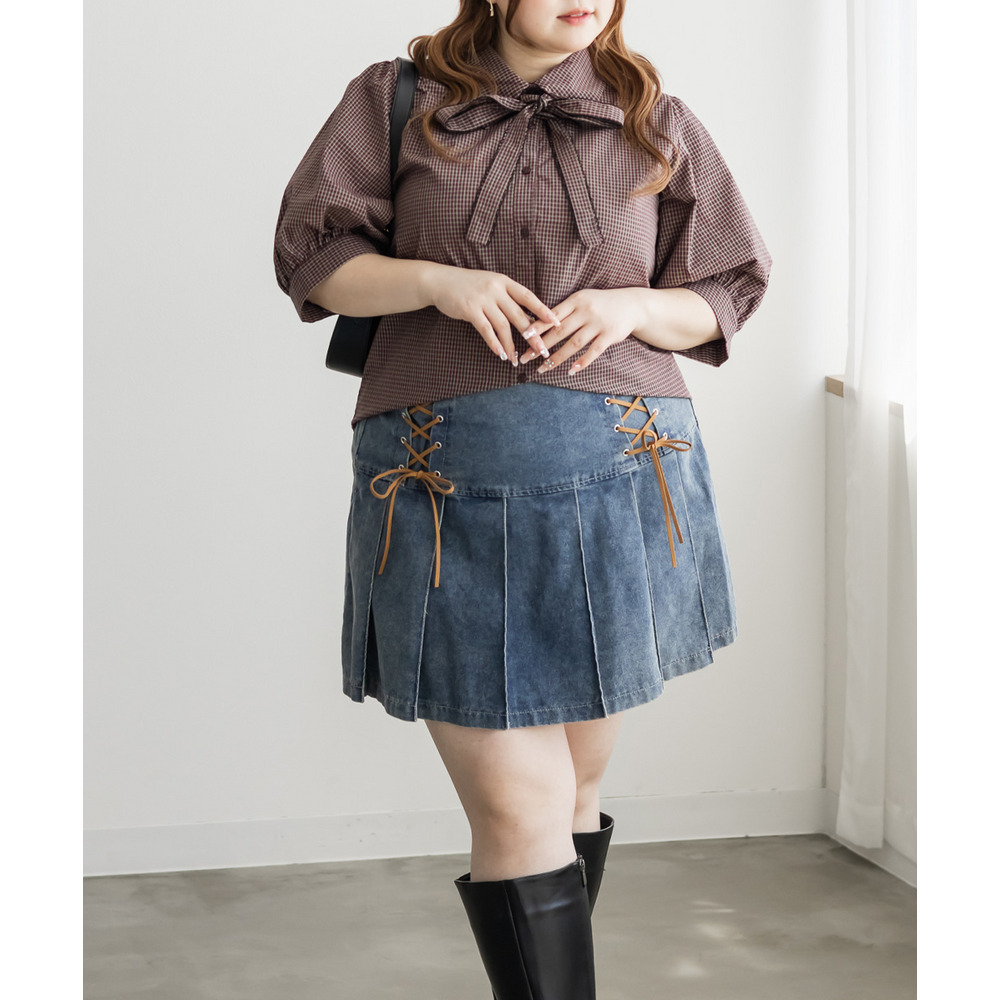 3Lサイズを着用しました。着用感はジャストでピッタリです。ヒップなどおおきめの方はワンサイズアップしてもいいかもしれません◎デニム素材ながら柔らかく軽い生地感で、プリーツが女性らしいシルエットを演出してくれます。スエードリボンとレースアップデザインがアクセントになり、シンプルなトップスを合わせるだけでトレンド感のあるスタイルが完成します!ウエストは後ろゴム仕様でフィット感があり、動きやすく快適な履き心地です。ミニ丈ながら広がりすぎないプリーツラインで、タイツやロングブーツと合わせれば秋冬も大人可愛く着こなせます♪ |
