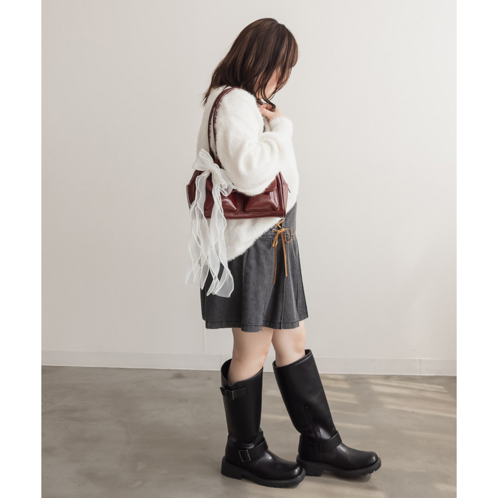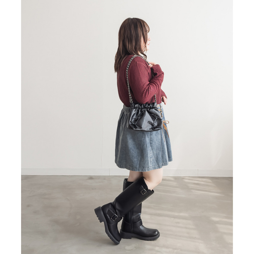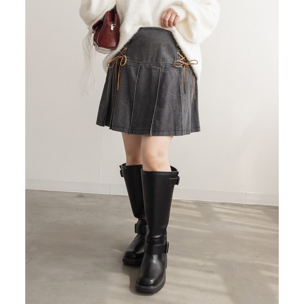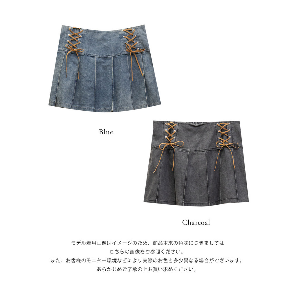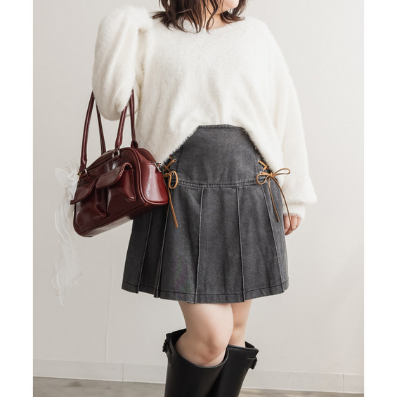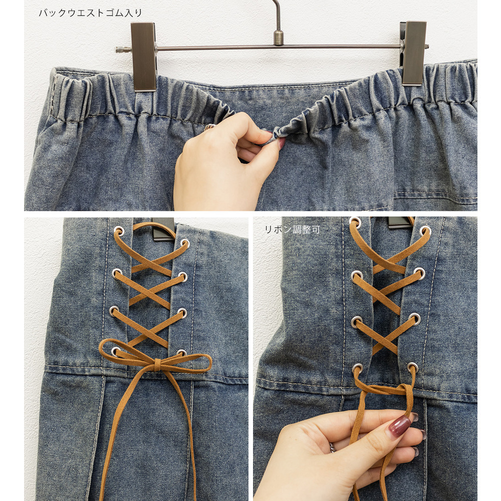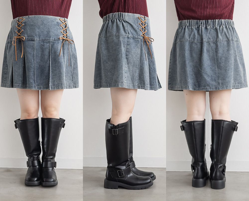 3Lサイズを着用しました。着用感はジャストでピッタリです。ヒップなどおおきめの方はワンサイズアップしてもいいかもしれません◎デニム素材ながら柔らかく軽い生地感で、プリーツが女性らしいシルエットを演出してくれます。スエードリボンとレースアップデザインがアクセントになり、シンプルなトップスを合わせるだけでトレンド感のあるスタイルが完成します!ウエストは後ろゴム仕様でフィット感があり、動きやすく快適な履き心地です。ミニ丈ながら広がりすぎないプリーツラインで、タイツやロングブーツと合わせれば秋冬も大人可愛く着こなせます♪ |