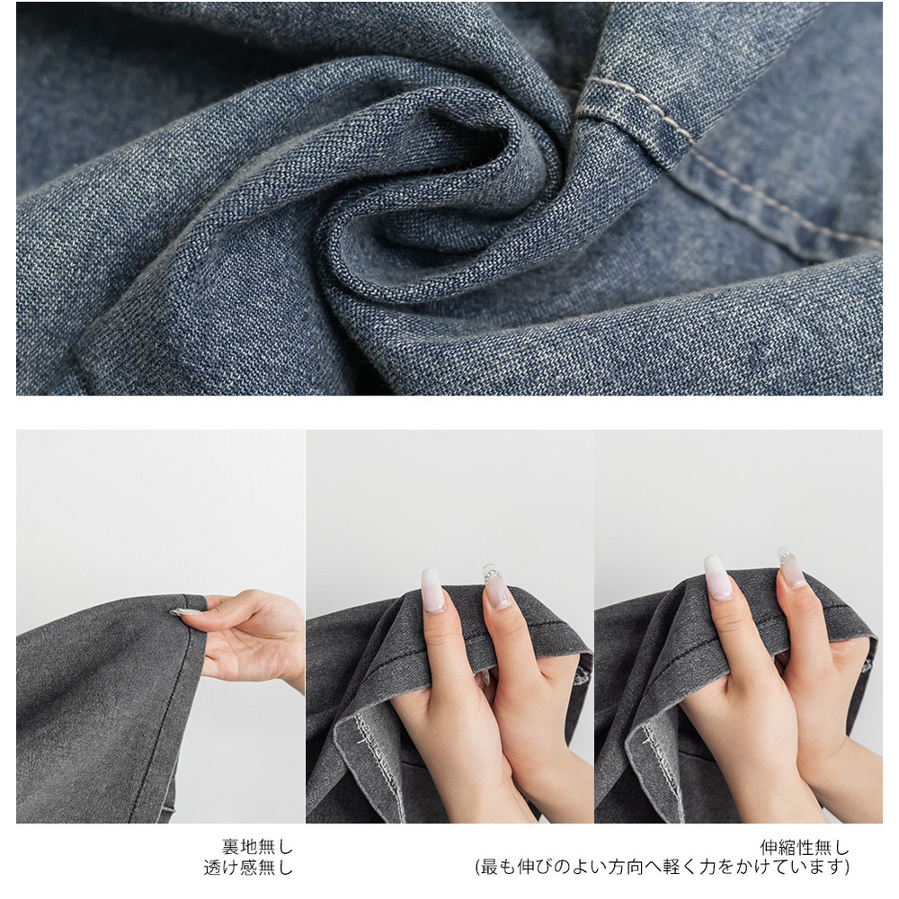 素材 | ■素材 【本体】綿65%、ポリエステル35%、【ひも部分】合成皮革 ■裏地・透け感・伸縮性 裏地無し、透け感無し、伸縮性無し ■ポケット 無し ■生地感 薄手のデニム素材です。 |