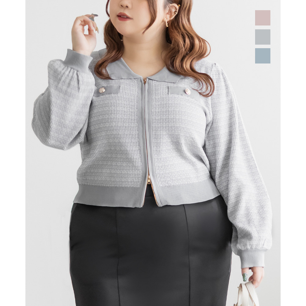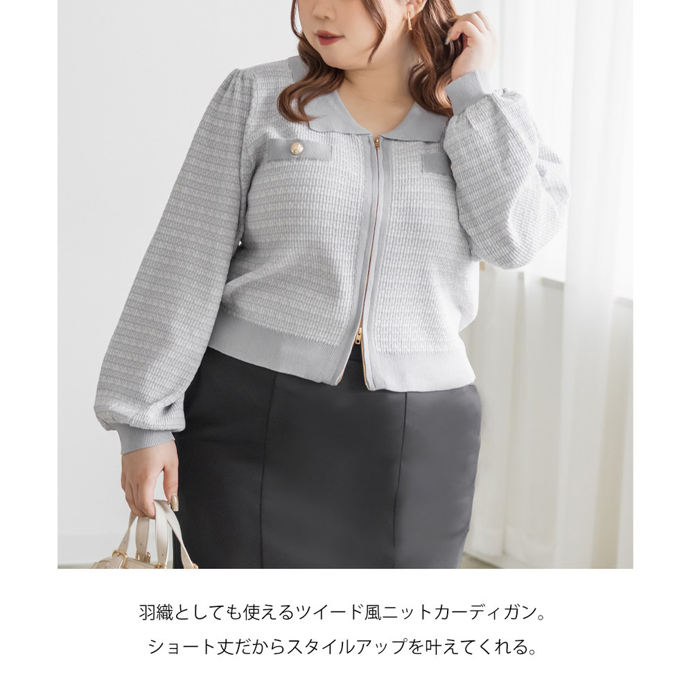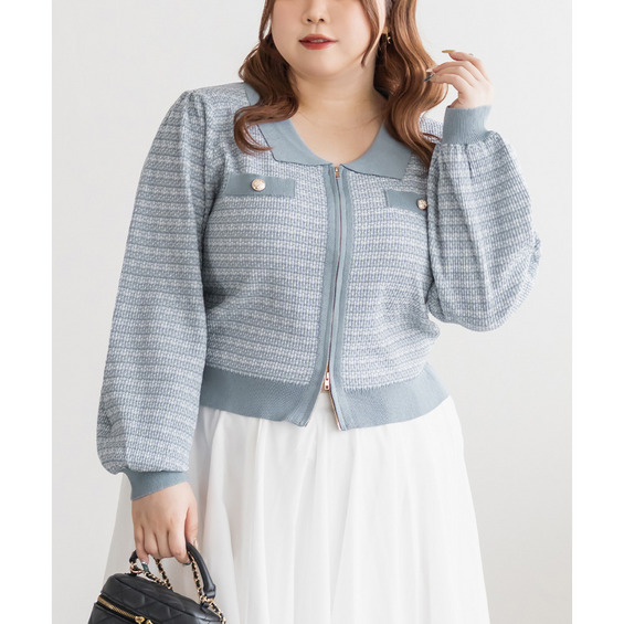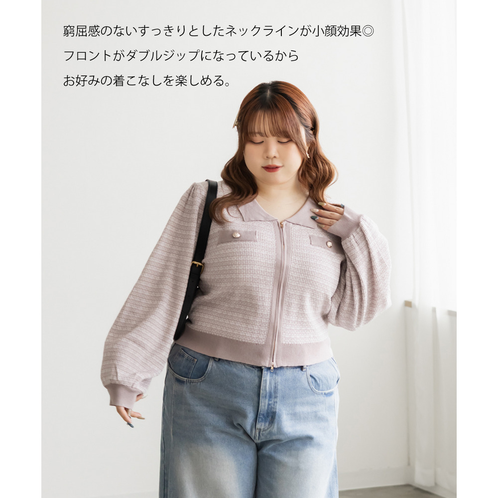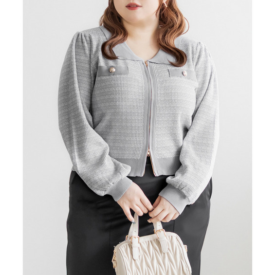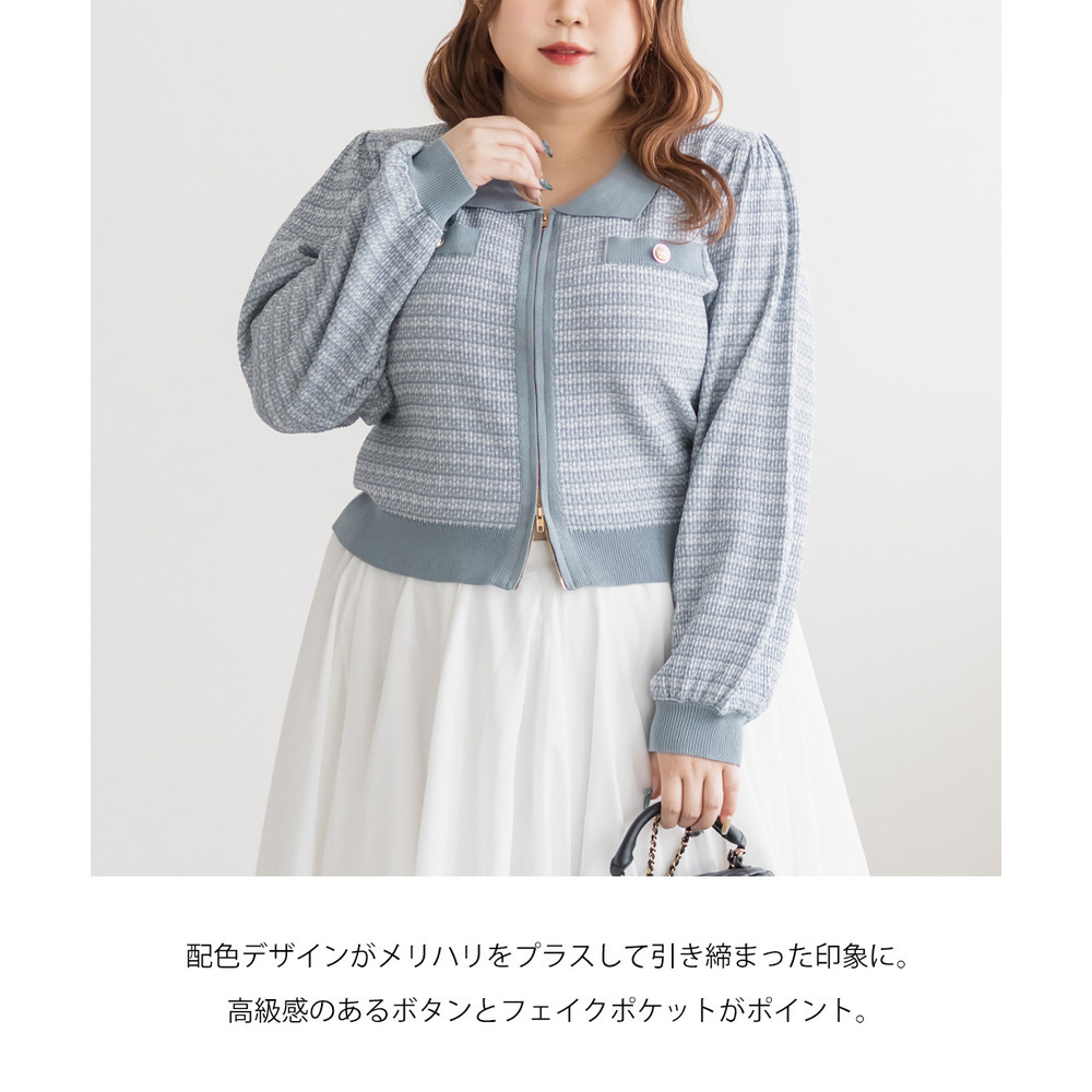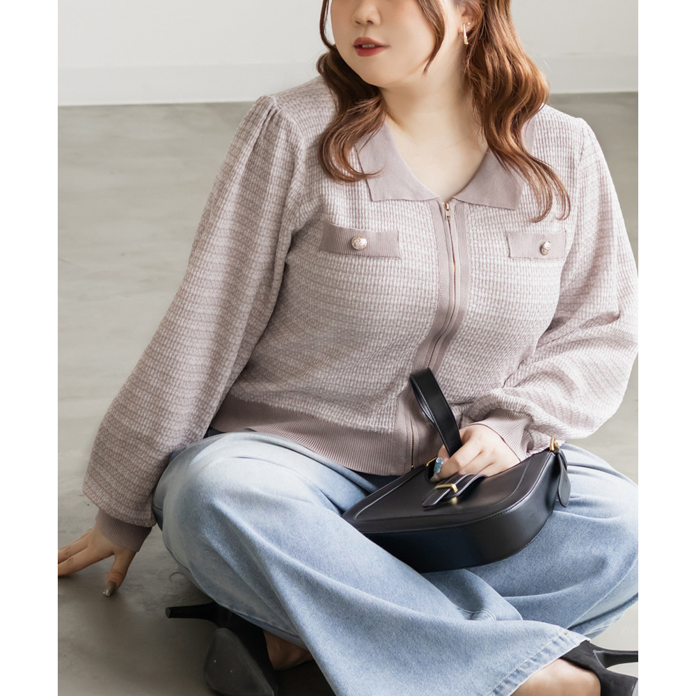 3Lサイズを着用してちょうどいいサイズ感でした。ツイード風の高見えするニット素材になっているので、上品に着こなすことができます◎ツイードっぽく見えるけど薄手で軽いニットなので、重く無くラクチンに着られました!長いシーズン着回しできるポイントでもあります!凹凸のある素材感なのでボディラインも拾いづらいです!程よくゆとりがありコンパクトな印象に着られるシルエットでアイテムなら安心感して着ることができます。配色とゴールドのボタンがアクセントになって、全体的にすっきりとフェミニンに着こなせます!ダブルジップで空き具合を調整できて、抜け感もプラスしてくれます!トレンド感もたっぷりな襟付きカーデは今季ほしい一押しアイテムです♪