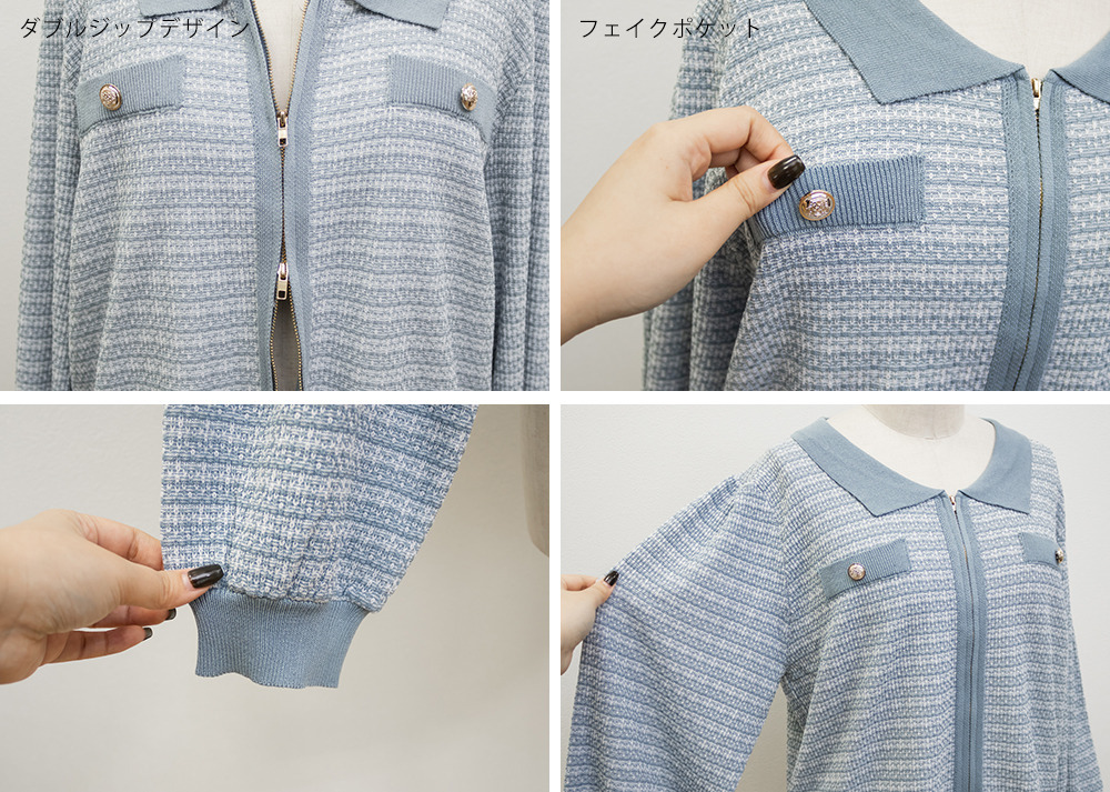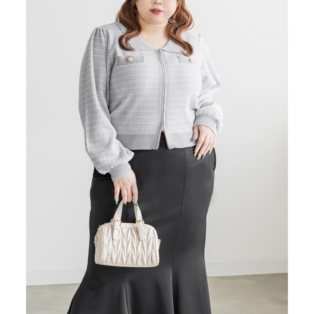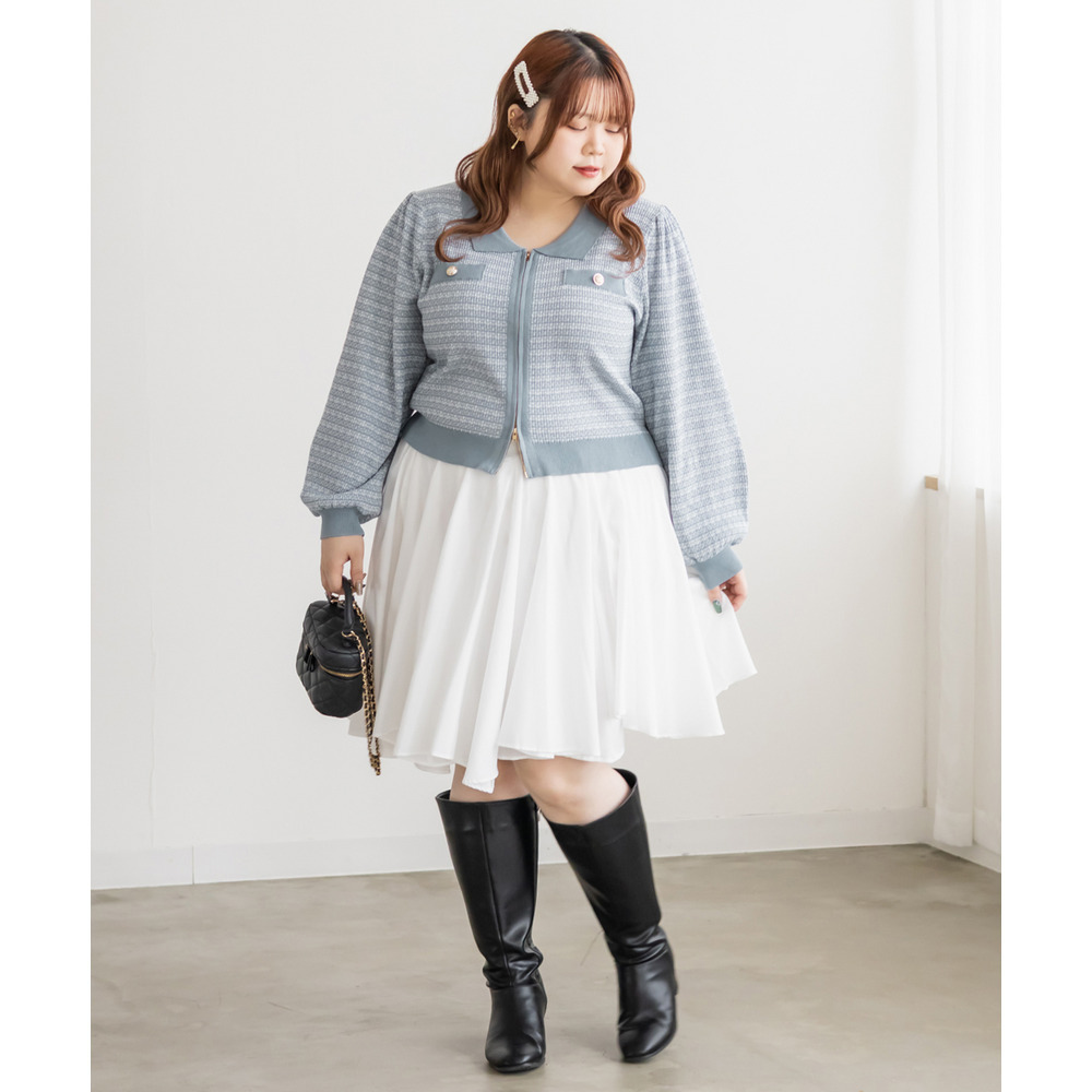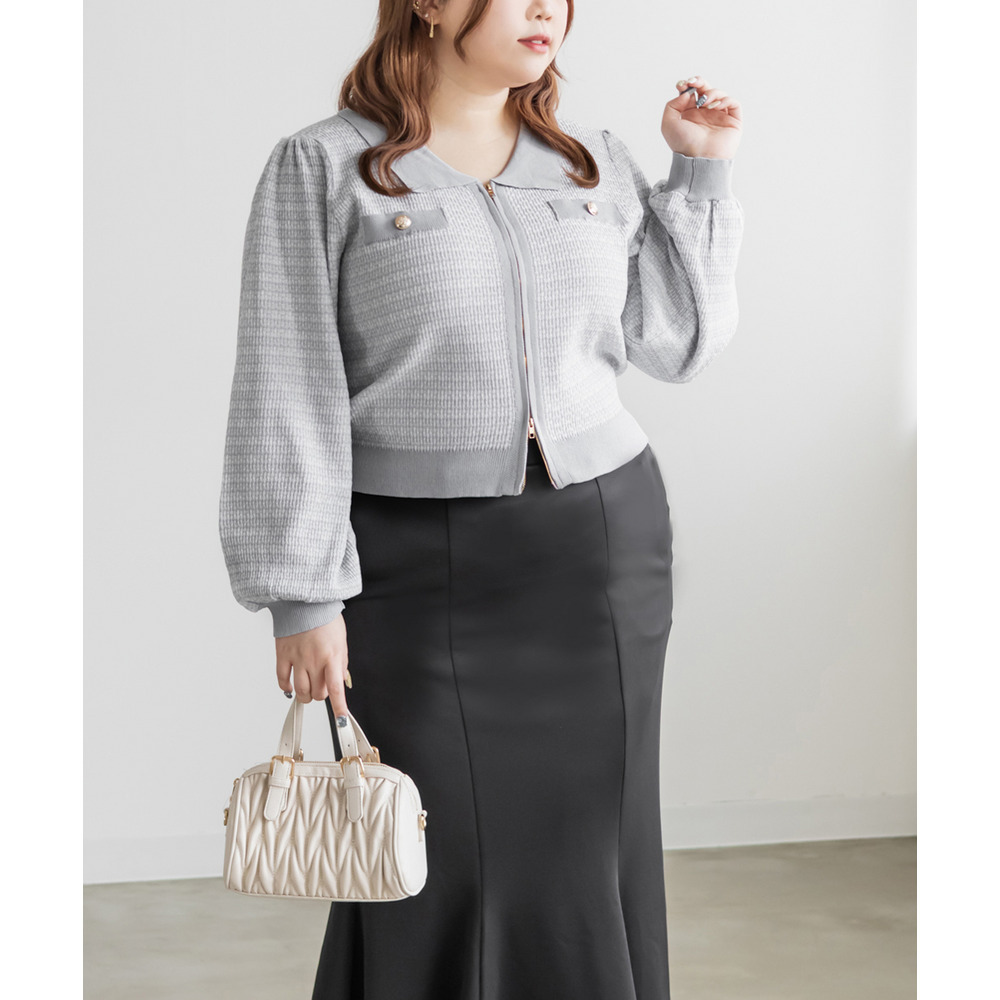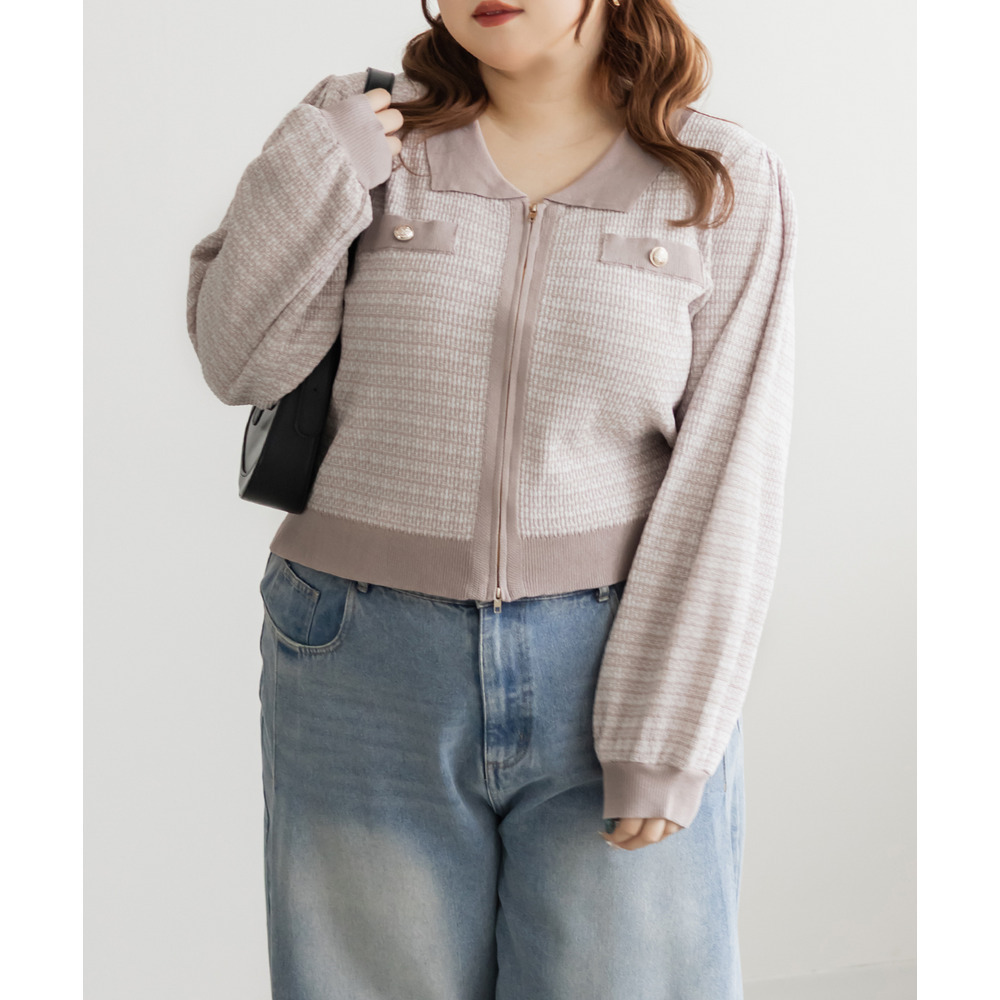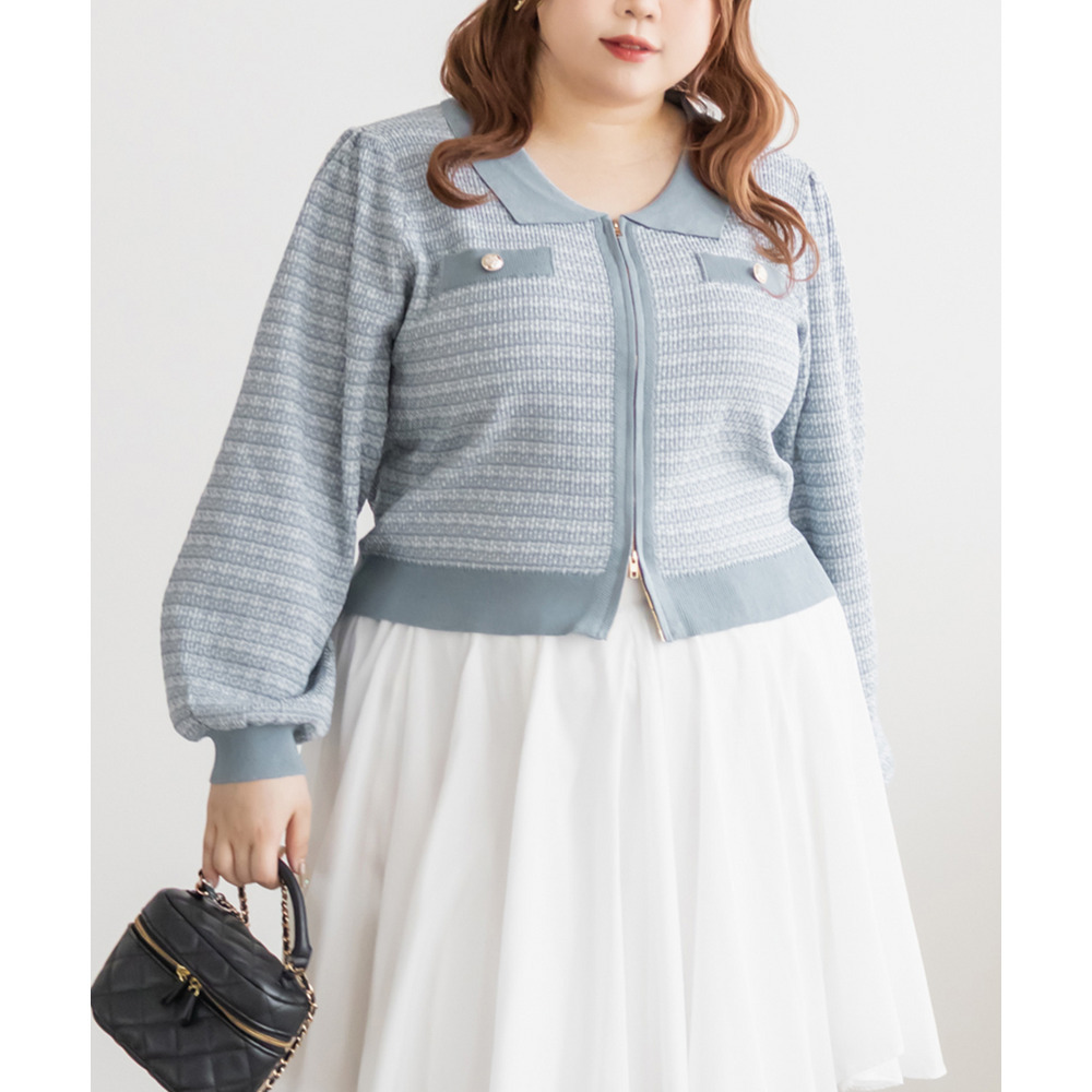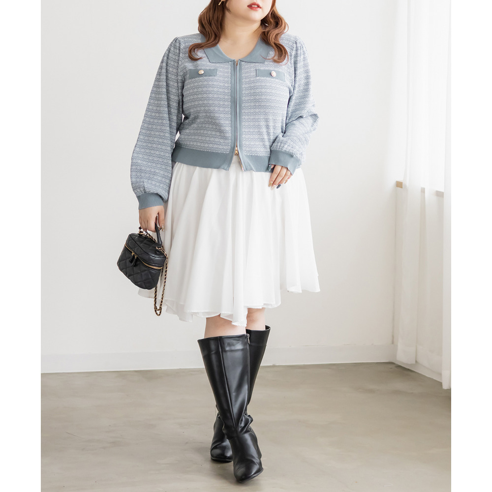 3Lサイズを着用してちょうどいいサイズ感でした。ツイード風の高見えするニット素材になっているので、上品に着こなすことができます◎ツイードっぽく見えるけど薄手で軽いニットなので、重く無くラクチンに着られました!長いシーズン着回しできるポイントでもあります!凹凸のある素材感なのでボディラインも拾いづらいです!程よくゆとりがありコンパクトな印象に着られるシルエットでアイテムなら安心感して着ることができます。配色とゴールドのボタンがアクセントになって、全体的にすっきりとフェミニンに着こなせます!ダブルジップで空き具合を調整できて、抜け感もプラスしてくれます!トレンド感もたっぷりな襟付きカーデは今季ほしい一押しアイテムです♪