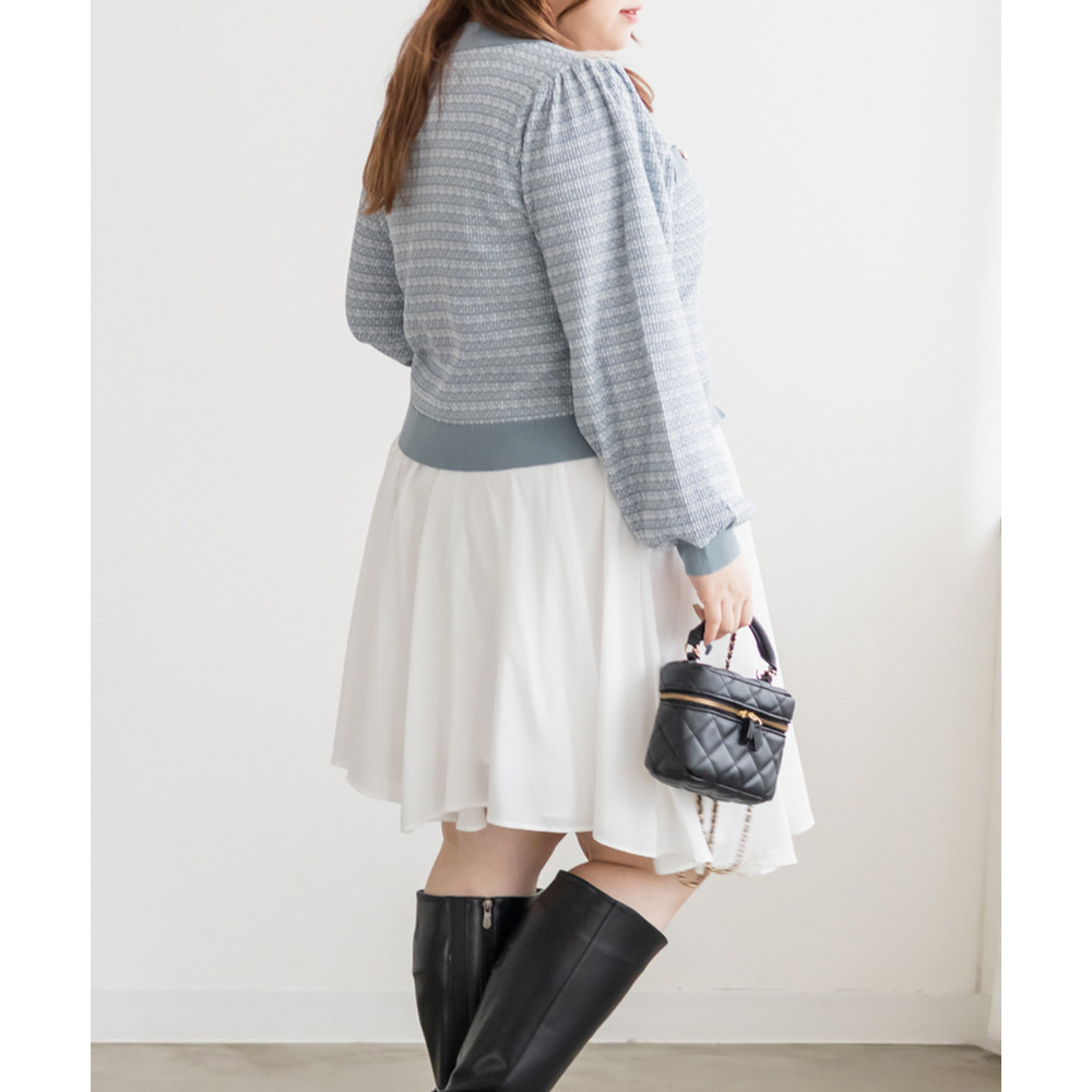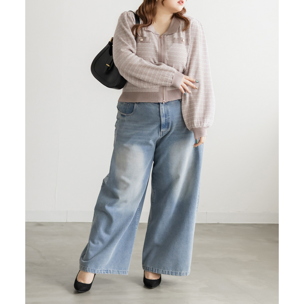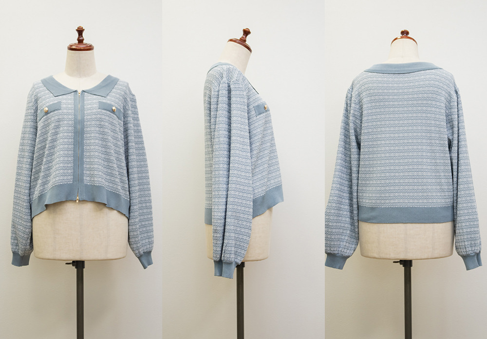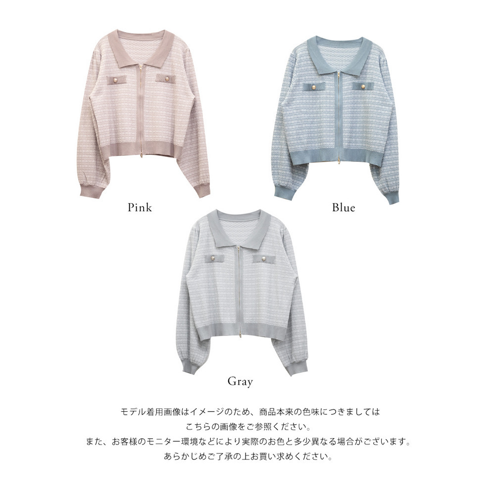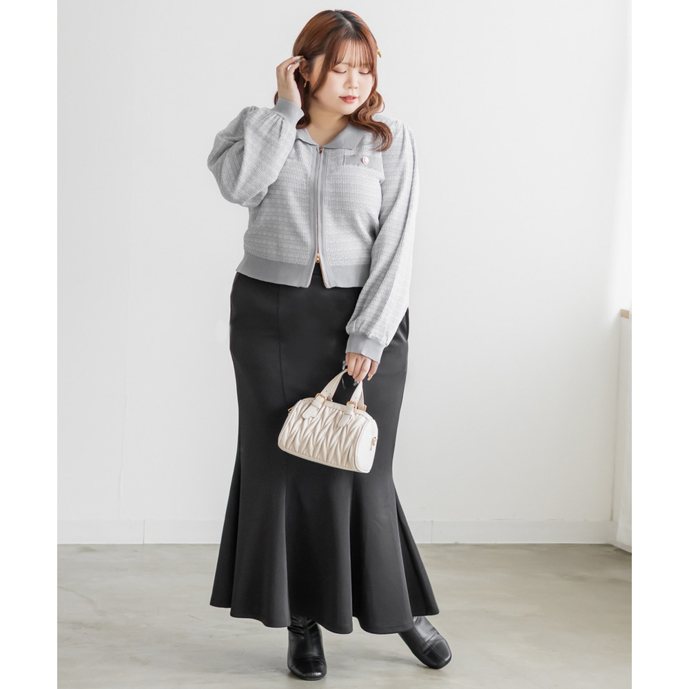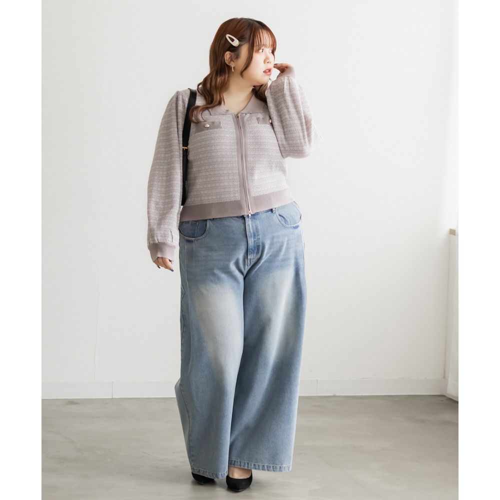 3Lサイズを着用してちょうどいいサイズ感でした。ツイード風の高見えするニット素材になっているので、上品に着こなすことができます◎ツイードっぽく見えるけど薄手で軽いニットなので、重く無くラクチンに着られました!長いシーズン着回しできるポイントでもあります!凹凸のある素材感なのでボディラインも拾いづらいです!程よくゆとりがありコンパクトな印象に着られるシルエットでアイテムなら安心感して着ることができます。配色とゴールドのボタンがアクセントになって、全体的にすっきりとフェミニンに着こなせます!ダブルジップで空き具合を調整できて、抜け感もプラスしてくれます!トレンド感もたっぷりな襟付きカーデは今季ほしい一押しアイテムです♪