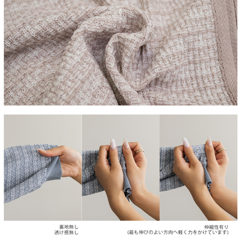 素材 ■素材 レーヨン70%、ナイロン30% ■裏地・透け感・伸縮性 裏地無し、透け感無し、伸縮性有り ■ポケット 無し ■生地感 程良い生地の厚みでやや凹凸のある素材です。