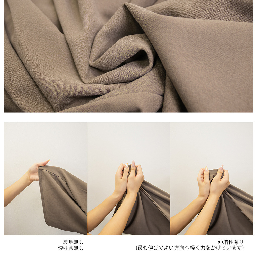 素材 ■素材 ポリエステル98%、ポリウレタン2% ■裏地・透け感・伸縮性 裏地無し、透け感無し、伸縮性有り ■ポケット 無し ■生地感 やわらかく伸縮性のある素材です。