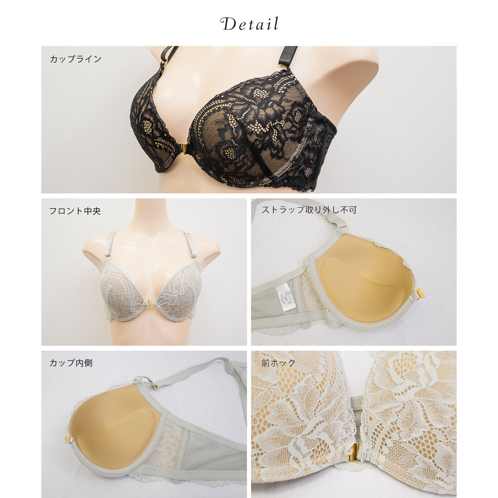 | 素材 | ■素材 ナイロン、ポリエステル、その他 ■裏地・透け感・伸縮性 裏地無し、透け感有り、伸縮性有り ■その他 【カップタイプ】3/4カップ・モールドカップ(丸みを形成した厚みのあるカップです)、【ホックの数】1段階フロントホック、【パット付属】なし、【パットポケット】なし、【ストラップ取外し】不可、【ワイヤー】あり、※タンブル乾燥禁止 |