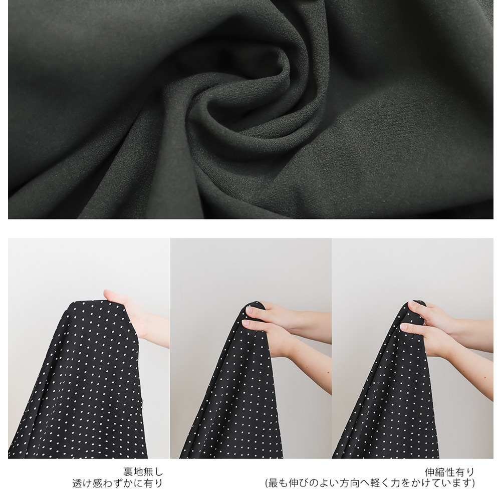 素材 ■素材 ポリエステル98%、ポリウレタン2% ■裏地・透け感・伸縮性 裏地無し、透け感わずかに有り、伸縮性有り ■ポケット 無し ■生地感 厚みが程よい生地の布帛です。