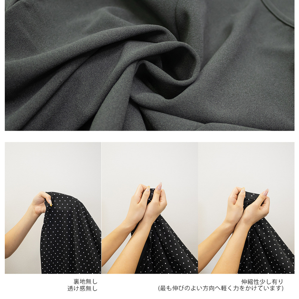 素材 ■素材 ポリエステル98%、ポリウレタン2% ■裏地・透け感・伸縮性 裏地無し、透け感無し、伸縮性無し ■ポケット 無し ■生地感 伸縮性のあるカットジョーゼット素材です。