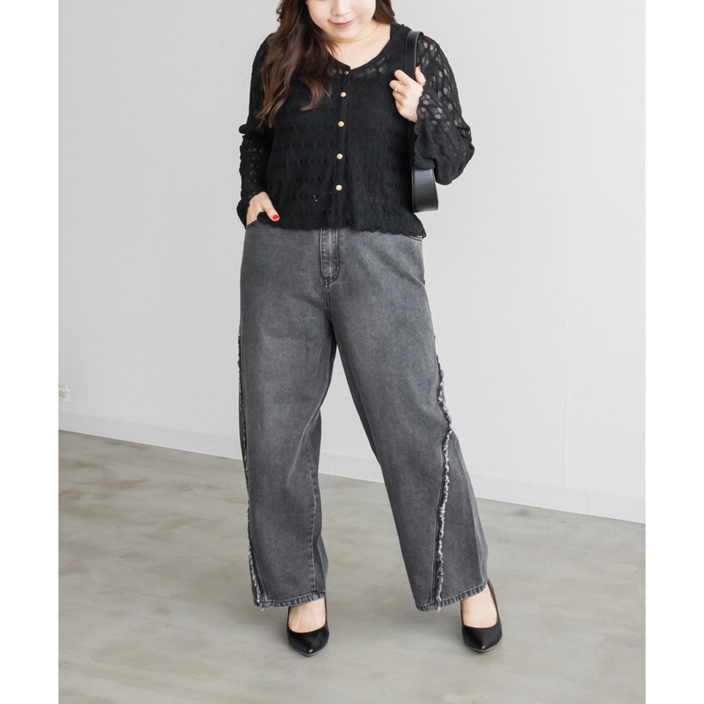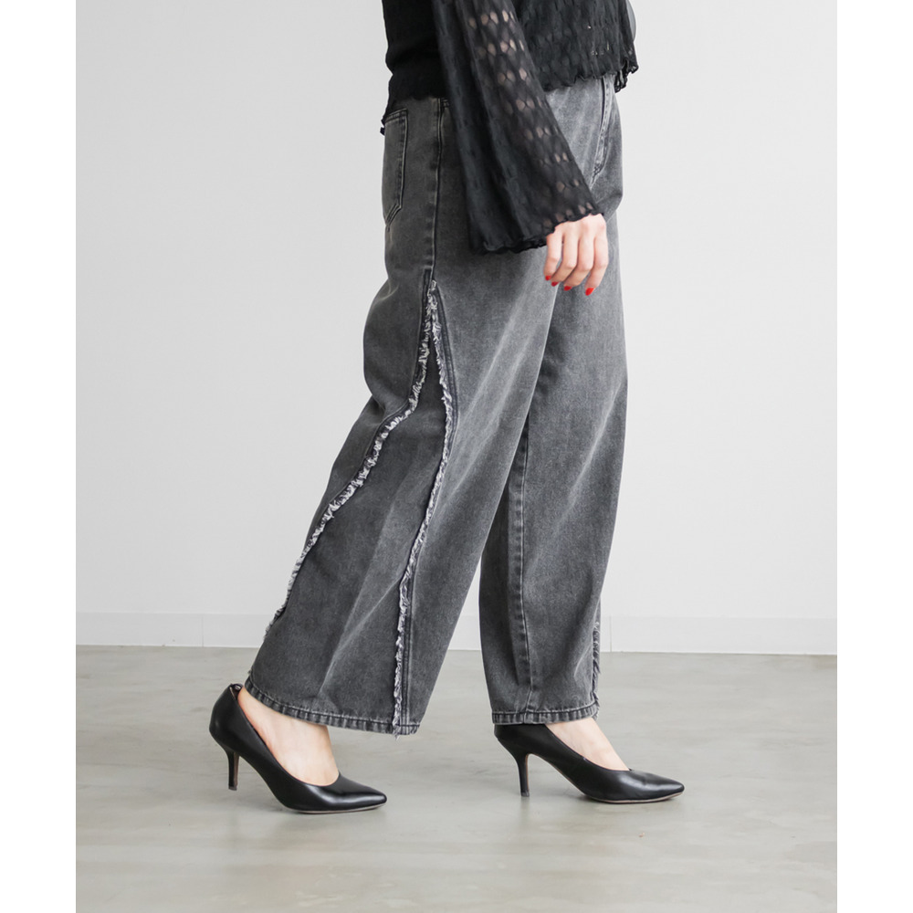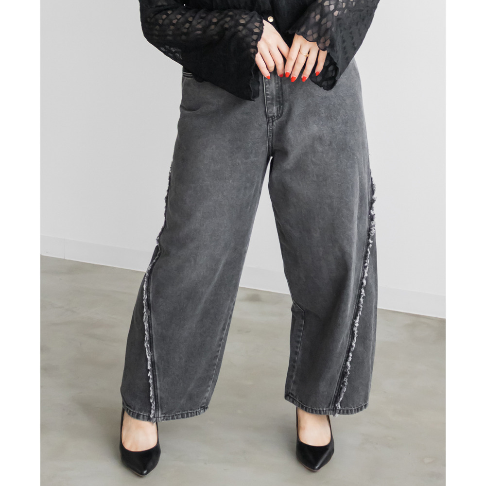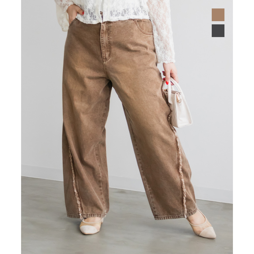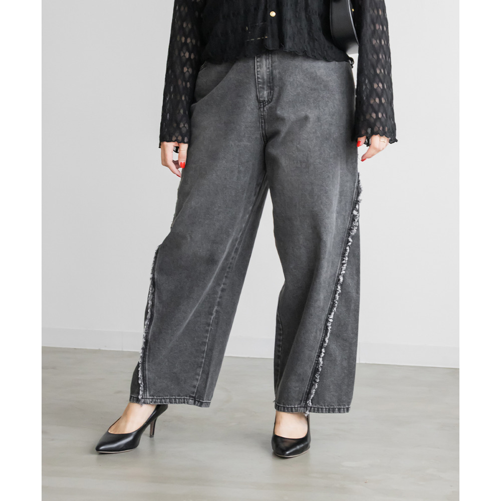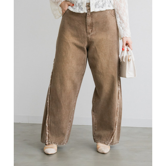 3Lサイズを着用しましたが、ちょうどいいサイズ感でした。カーブラインが特徴的なシルエットで、脚のラインをさりげなくカバーしながらトレンド感のある着こなしが叶います。フリンジデザインがこなれた雰囲気をプラスし、シンプルなトップスと合わせるだけでおしゃれに決まる一本です。視覚効果もあってすっきりした印象にも◎デイリー使いにもぴったりな優秀アイテムです。