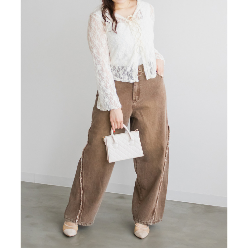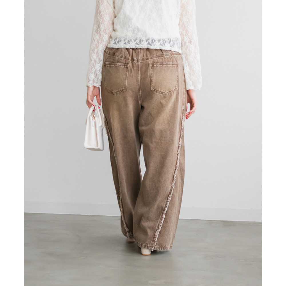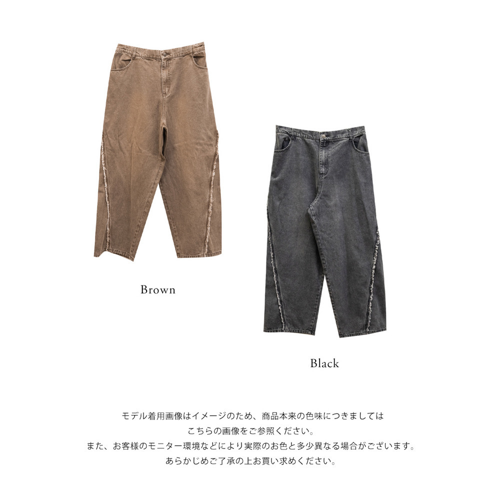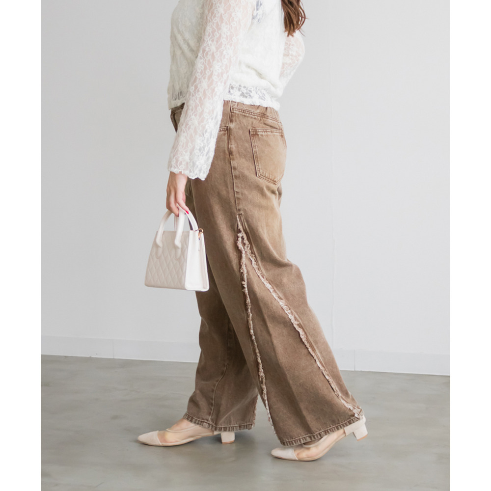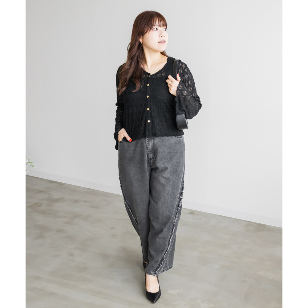 3Lサイズを着用しましたが、ちょうどいいサイズ感でした。カーブラインが特徴的なシルエットで、脚のラインをさりげなくカバーしながらトレンド感のある着こなしが叶います。フリンジデザインがこなれた雰囲気をプラスし、シンプルなトップスと合わせるだけでおしゃれに決まる一本です。視覚効果もあってすっきりした印象にも◎デイリー使いにもぴったりな優秀アイテムです。