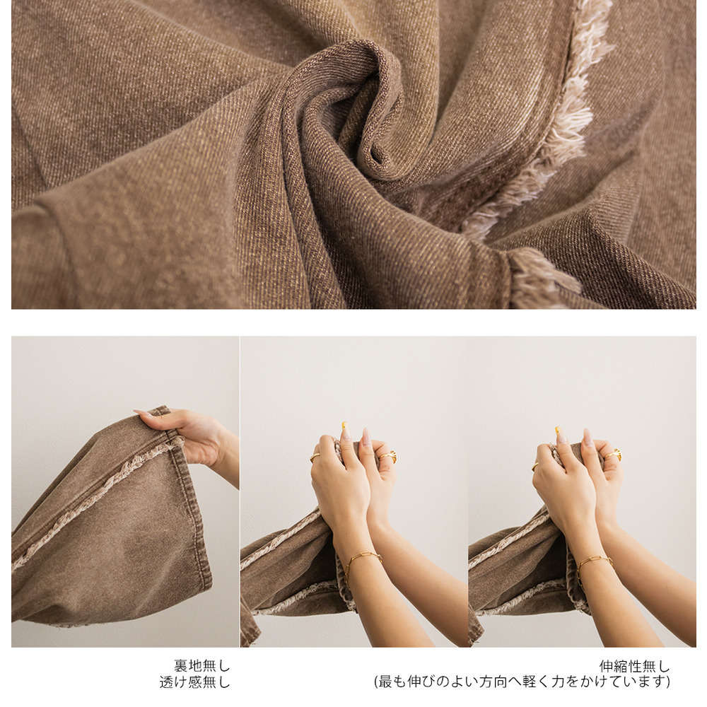 素材 ■素材 綿75%、再生繊維10%、レーヨン8%、ポリエステル7% ■裏地・透け感・伸縮性 裏地無し、透け感無し、伸縮性無し ■ポケット 有り ■生地感 伸縮性のない一般的なデニム生地です。