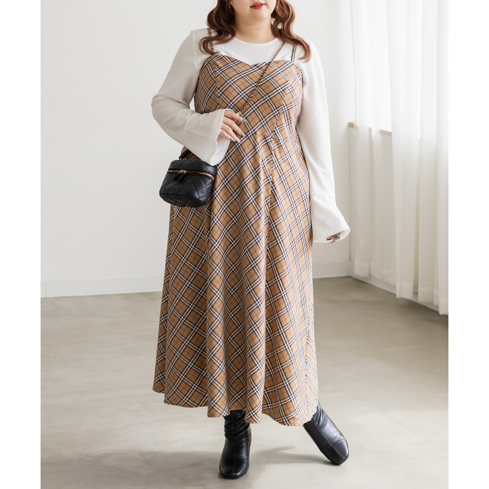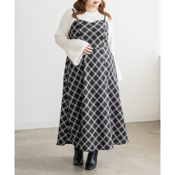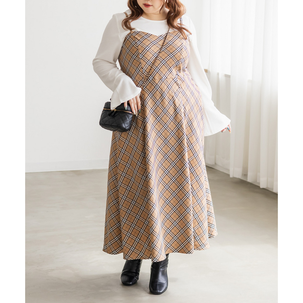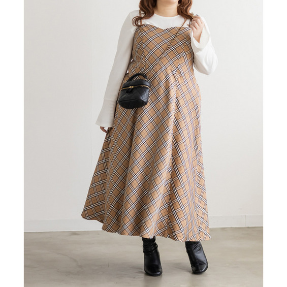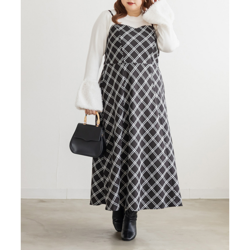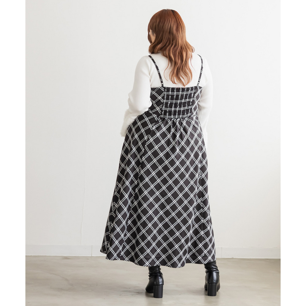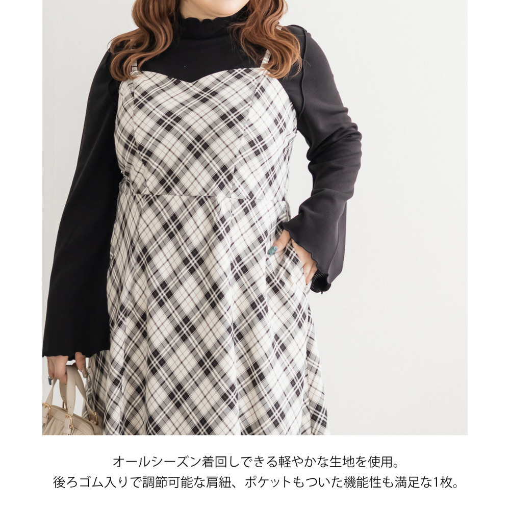 3Lサイズを着用して、ちょうどよくリラックスして着られました◎後ろはらくちんなシャーリングゴムで、ウエストから綺麗に広がるデザインが体のラインを拾わず、動くたびに軽やかに揺れてとても華やかです♪トレンド感たっぷりのチェック柄が、大人の甘さをプラスしてくれます!肩紐の長さ調整ができるので、好みの丈感に合わせられて安心感もあり、Tシャツやブラウスを重ねれば、オールシーズン着回せそうな優秀アイテムです!