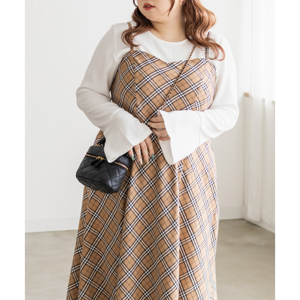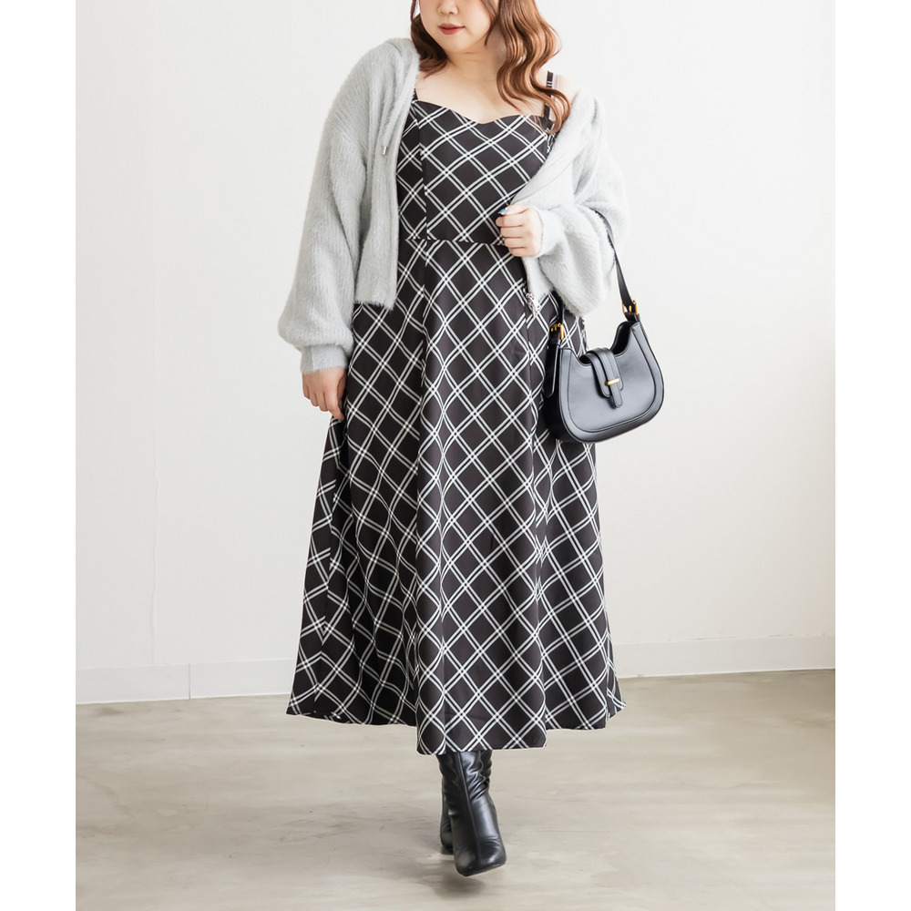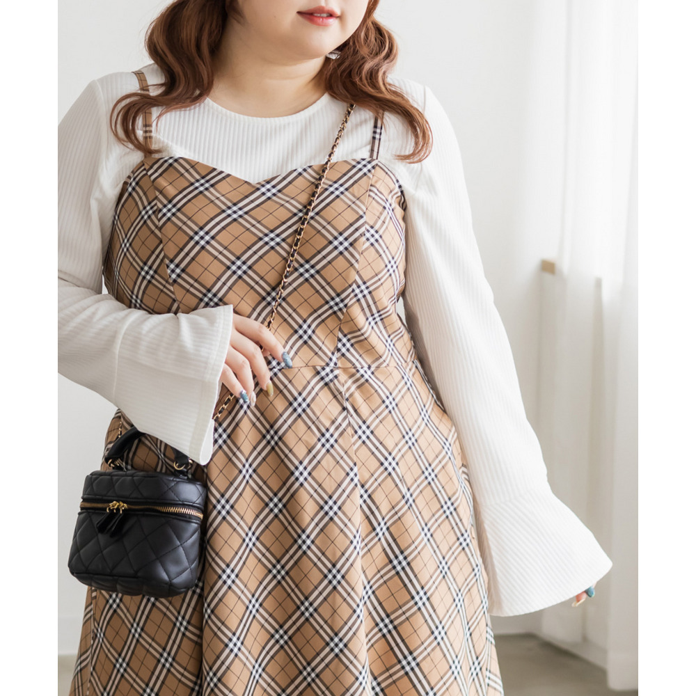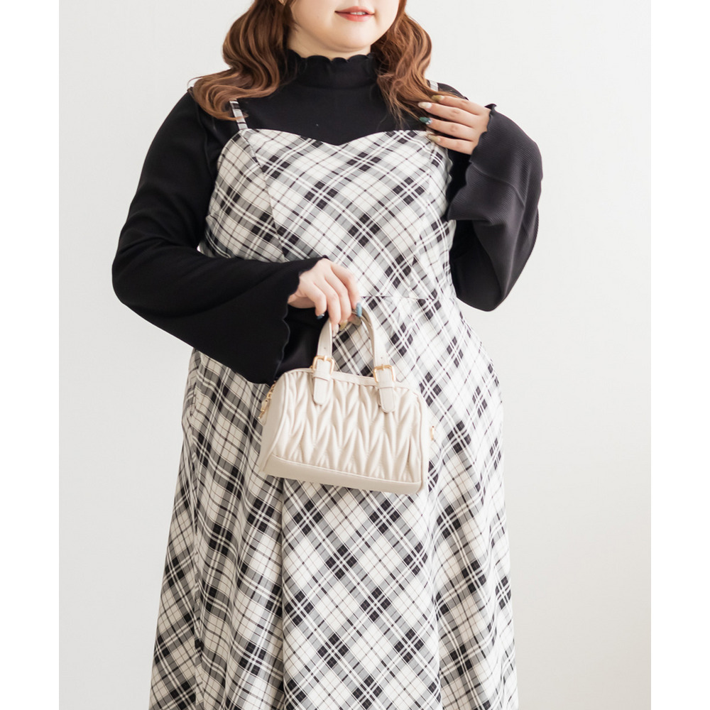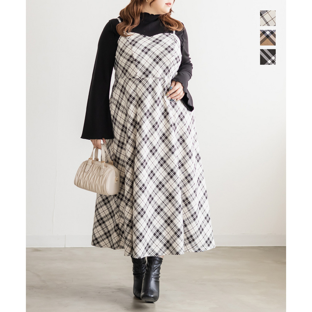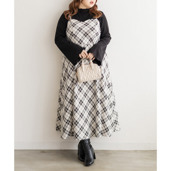 3Lサイズを着用して、ちょうどよくリラックスして着られました◎後ろはらくちんなシャーリングゴムで、ウエストから綺麗に広がるデザインが体のラインを拾わず、動くたびに軽やかに揺れてとても華やかです♪トレンド感たっぷりのチェック柄が、大人の甘さをプラスしてくれます!肩紐の長さ調整ができるので、好みの丈感に合わせられて安心感もあり、Tシャツやブラウスを重ねれば、オールシーズン着回せそうな優秀アイテムです!